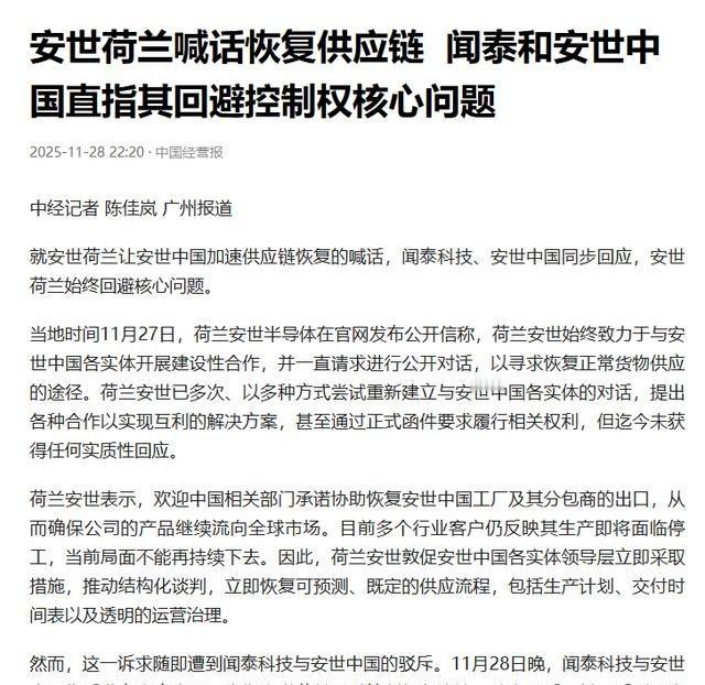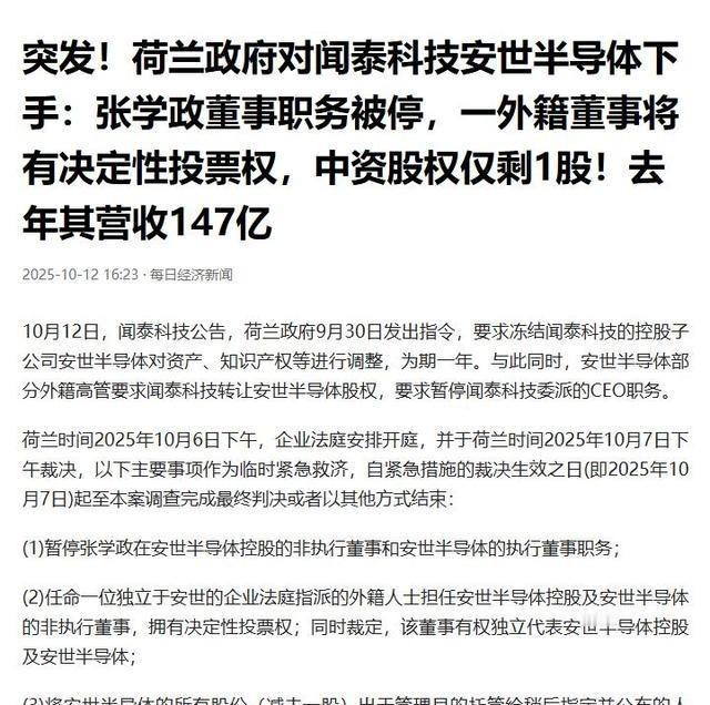 安世半导体,荷兰如今似乎下定决心不归还了,盛传的经济大臣也不来了。更让人在意的是,荷兰安世已经悄悄通过马来西亚等国的工厂,慢慢恢复了部分产能,反观安世中国这边,虽说自身封装测试产能底子不错,可荷兰总部说断就断了晶圆原材料供应,硬生生把中方逼到了靠国产替代救急的地步。 闻泰科技早在2024年12月被美国列入实体清单,2025年9月29日美国商务部出台50%股权穿透规则,持股超50%的子公司连带受制裁,安世半导体因此受波及。第二天荷兰政府援引1952年《货物供应法》,以国家安全为由冻结安世全球资产,禁止股权和知识产权调整。10月7日荷兰企业法庭裁定暂停张学政CEO职务,将闻泰99%股权托管第三方,荷兰籍高管接任临时CEO。荷兰承认先行动后通知中美英德四国。闻泰反击,10月15日提交争端通知,指责违反中荷2001年投资保护协定,若6个月未解决将国际仲裁索赔80亿美元。中国商务部禁止安世中国出口特定部件,占全球70%封装测试产能。 10月26日荷兰以付款纠纷为由停止向东莞工厂供应欧洲晶圆,切断中国区员工报酬和系统权限,安世拆分成欧洲和中国两个体系。全球芯片供应链陷入僵局,汽车业受重创。本田墨西哥工厂停产,加拿大减产一半,日产库存仅够到11月初。大众汽车五年来首次季度亏损,欧洲汽车制造商协会警告产能可能降15%。安世芯片单价0.1到1美元,却控制车身和电池功能,车企不囤库存,断供即停线。欧元区对华芯片采购人民币结算占比从12%升至35%。荷兰加速扩建马来西亚和菲律宾后端产能,转移封测订单。车规级芯片验证周期1到2年,荷兰目标2026年摆脱中国依赖。 安世中国转向国产替代,11月初与本土供应商敲定2026年IGBT晶圆产能。上海鼎泰匠芯每月产3万片12英寸车规级IGBT晶圆,芯联集成和上海GAT半导体供应8英寸晶圆。IGBT营收仅占安世总营收0.1%,短期难填补欧洲断供缺口。荷兰经济大臣访华计划取消,表面暂停部长令但法庭裁决有效,控制权未归还。11月19日荷兰宣布暂停干预,闻泰称未完全恢复治理权。11月27日安世荷兰发公开信,指责中国子公司不回应,把供应链混乱推给中方。次日闻泰声明逐条反驳,指出荷兰先接管并断供。 12月闻泰主席警告芯片混乱将恶化,荷兰政府和本地高管意图驱逐闻泰。安世中国锁定本土晶圆供应覆盖2026年生产。德国监管机构审查安世交易,受美出口压力影响。中国敦促荷兰撤销行政令,强调过分干预企业运营。全球汽车供应链持续动荡,部分工厂面临全面停工风险。安世事件凸显美对华科技遏制通过荷兰落地,配合去风险策略。美国6月起施压荷兰移除中国CEO,避免实体清单影响。 闻泰邀请荷兰经理访华化解治理纠纷,谈判持续未决。安世承诺遵守美限制,但供应链脆弱性暴露。中国禁止安世出口欧盟,导致供应中断。荷兰干预源于美规则同步,几乎非巧合。事件推动能源采集伙伴计划,强调可持续实践。安世推出新功率器件,如40-100V汽车MLPAK MOSFETs,提升密度。2024可持续发展报告重申环保承诺。工程师交流论坛上线,讨论IC应用。 安世产品超16000种,覆盖双极晶体管、二极管、MOSFETs、GaN FETs、IGBTs和逻辑IC。汽车应用超6000种AEC-Q合格产品,支持ADAS和电动化。工业功率领域用于自动化和可再生能源。移动设备专注快速充电,计算消费品包括SSD。子系统如AC/DC转换器提供参考设计。电热模型和选择工具辅助开发。能源采集合作包括行业领导者,推动无电池解决方案。 事件中荷兰动用尘封73年法律,学者批评违反契约精神。中国回应出口控制,影响欧盟供应。美暂停对华制裁后,荷兰调整立场,但法庭令仍执行。张学政职务未恢复,闻泰推动法律维权。全球芯片市场风险加剧,供应链需多元化。安世拆分运营,欧洲由法院管理,中国与闻泰合作。产能转移与国产替代并行,纠纷影响人民币国际化进程。