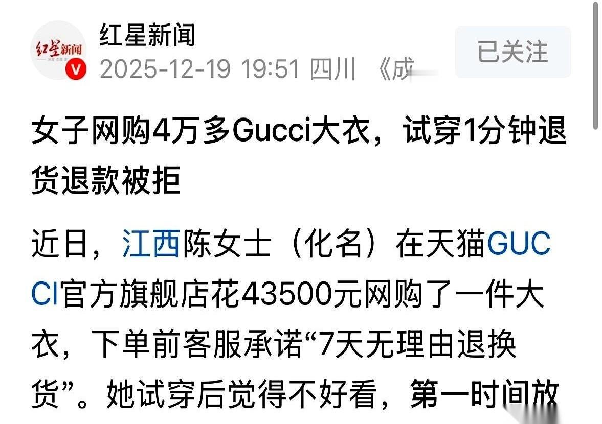 我跟你讲,这事儿真的绝了。 一件四万三的Gucci大衣,一个女人就试穿了不到一分钟,退货。 商家说:不行。理由是,腰上,有一根半厘米的线头。 就因为这一根线头,四万三,没了。 你说逗不逗。 花四万多块钱买件衣服,图啥?不就图个品牌、图个体验、图个“七天无理由”给我兜底的那个安全感吗? 结果呢?安全感变成了最大的陷阱。 人家姑娘收到货,满心欢喜拆开,在镜子前比划了一下,觉得哎呀,好像不太适合自己。这太正常了。 赶紧小心翼翼叠好,包装、丝带、防尘袋,原样封回去,叫来快递员当面检查,没问题,寄走。 一套操作,滴水不漏。 结果到了商家仓库,人家在强光下一照,用放大镜一看:喏,这里,脱线了。属于“商品不完好”,影响二次销售,不退。 那一刻,我都能想象到那个姑娘有多懵。 就好像你小心翼翼地谈了场恋爱,最后对方跟你分手,理由是你吃饭吧唧嘴的声音太大。 不是不爱了,而是你“不完好”。 荒诞吗? 更荒诞的是,这根线头,到底是谁的锅?是出厂就有的微瑕,还是路上颠簸出来的,还是姑娘试穿那一分钟“瞪”出来的? 谁也说不清。 但商家一句话就把你堵死了:“我们出库有三道质检,绝对完美。” 潜台词就是:不是我的问题,那就是你的问题。 说白了,这就是一场彻头彻尾的“规则霸凌”。 他们用仓库里、显微镜下的“专业标准”,来审判你在卧室暖光灯下的“正常试穿”。 这以后谁还敢网购贵东西? 是不是拆个快递都得架上三台摄像机,全程录像,还得戴上白手套,生怕呼吸重了点,给衣服吹出个褶子? 所谓的“七天无理由”,瞬间变成了一句空话。 它真正的意思是:在商家“认为你没任何问题”的前提下,才可以无理由退货。 那个“理由”,最终还是他们说了算。 四万三,买的不是一件大衣,是买了一场漫长的、令人心力交瘁的拉扯,买了一个教训: 在不对等的话语权面前,你的清白,一文不值。