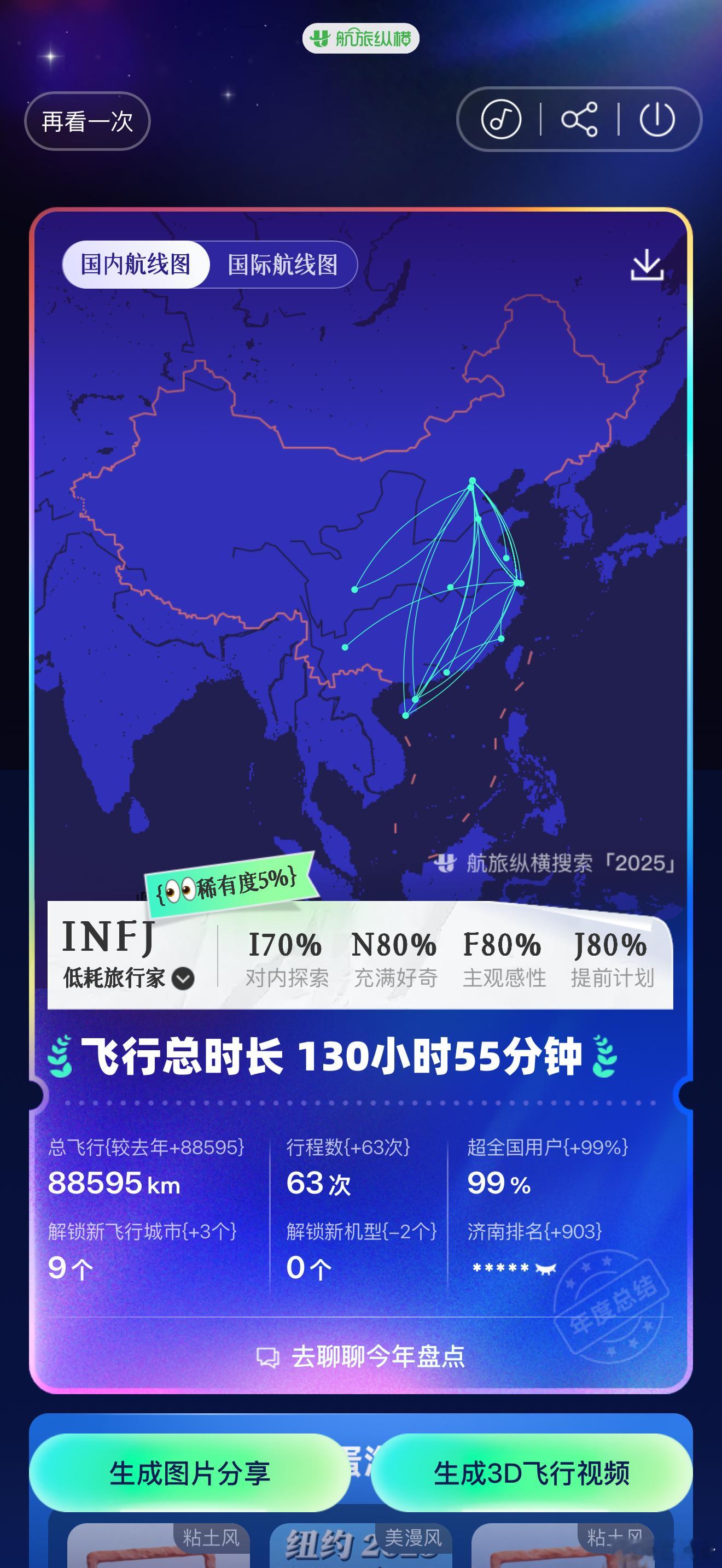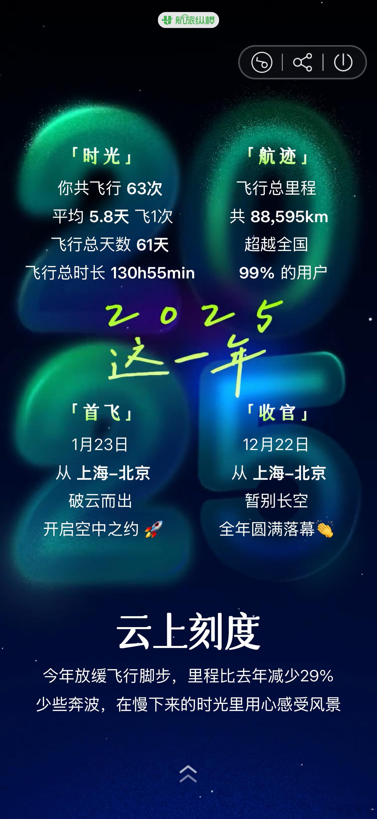 航旅纵横这个年度报告太有意思了。有一位旅客和我5次同乘一个航班。太巧了,这个人肯定不是我认识的身边人。或许也是个家住上海的京沪打工人。 还有个bug,今天才26号就生成了2025年度报告,接下来今年还有航班呢