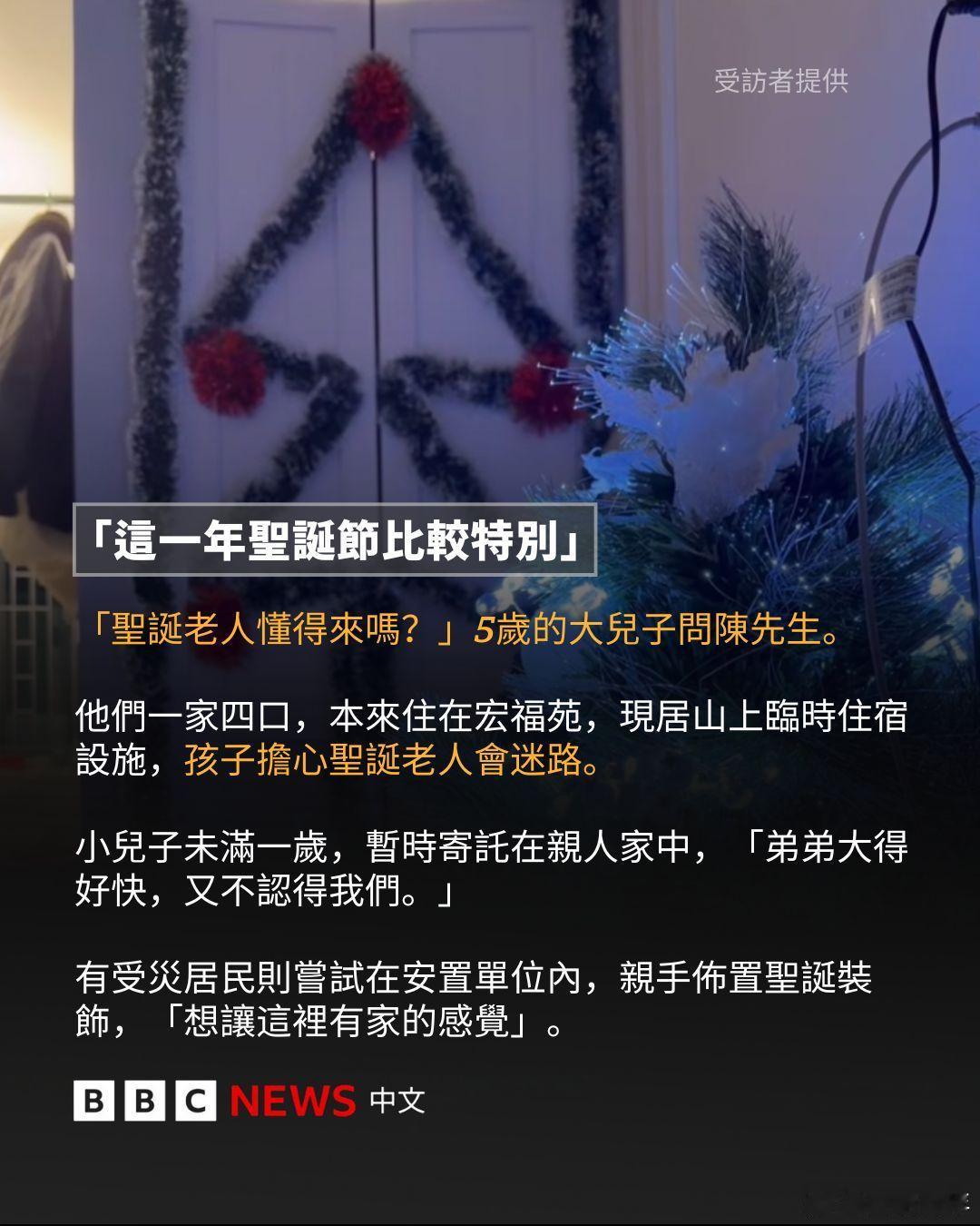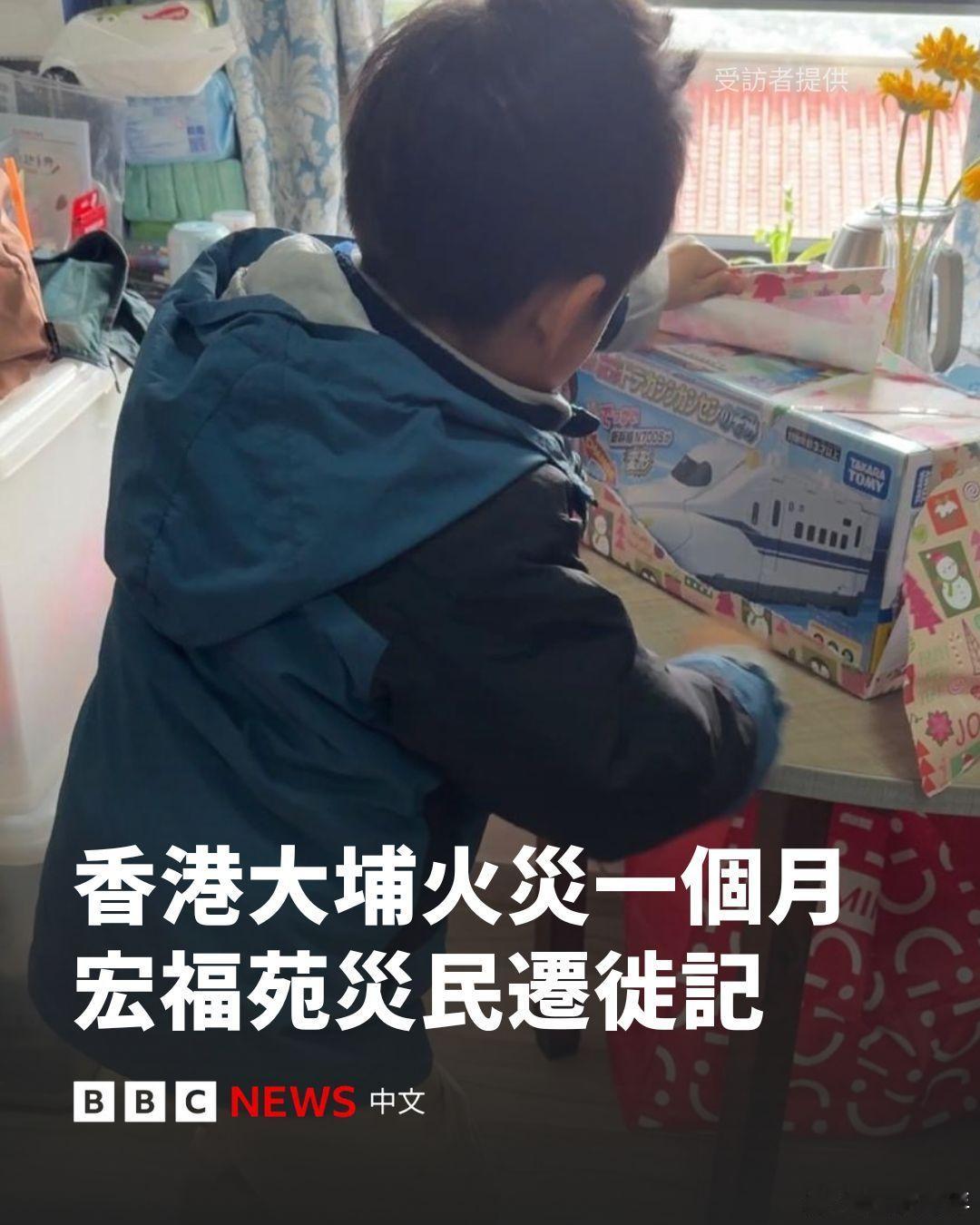 香港大埔火灾发生一个月后,几个受灾家庭接受采访。“圣诞老人懂得来吗?”5岁大儿子问陈先生。他们一家人原本住在宏福苑,现居临时住所。