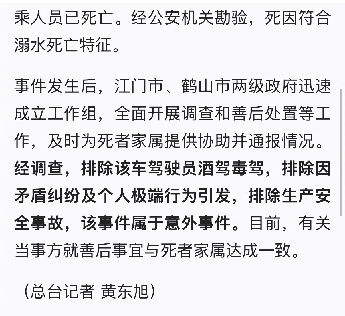 #通报确认一家五口驾车坠江系意外#【#广东鹤山汽车坠江事件通报#:排除生产安全事故 属意外事件】#一家五口驾车误入施工通道遇难#近日,广东鹤山市古劳镇发生一起小汽车坠江事件,有关情况通报如下:2025年12月13日下午,黄某(男,34岁)驾驶小汽车搭载4人进入鹤山市古劳镇地界,沿西江大堤路段自西北向东南方向直行,于17时27分许左转驶入南海至新会高速公路TJ01标段在建西江特大桥栈桥工地。工地入口侧设有“限速10公里”“施工重地非作业人员禁止入内”等警示标志,入口两侧设有减速带。黄某驶入工地后,向前行驶约120米后撞破栈桥右侧防护栏坠落西江。接报后,鹤山市迅速组织公安、交通、应急、海事、卫健等部门和蓝天救援队等专业救援力量及设备开展搜救工作。12月14日11时许,落水车辆被打捞上岸,确认车上5名司乘人员已死亡。经公安机关勘验,死因符合溺水死亡特征。事件发生后,江门市、鹤山市两级政府迅速成立工作组,全面开展调查和善后处置等工作,及时为死者家属提供协助并通报情况。经调查,排除该车驾驶员酒驾毒驾,排除因矛盾纠纷及个人极端行为引发,排除生产安全事故,该事件属于意外事件。目前,有关当事方就善后事宜与死者家属达成一致。(央视新闻)网页链接