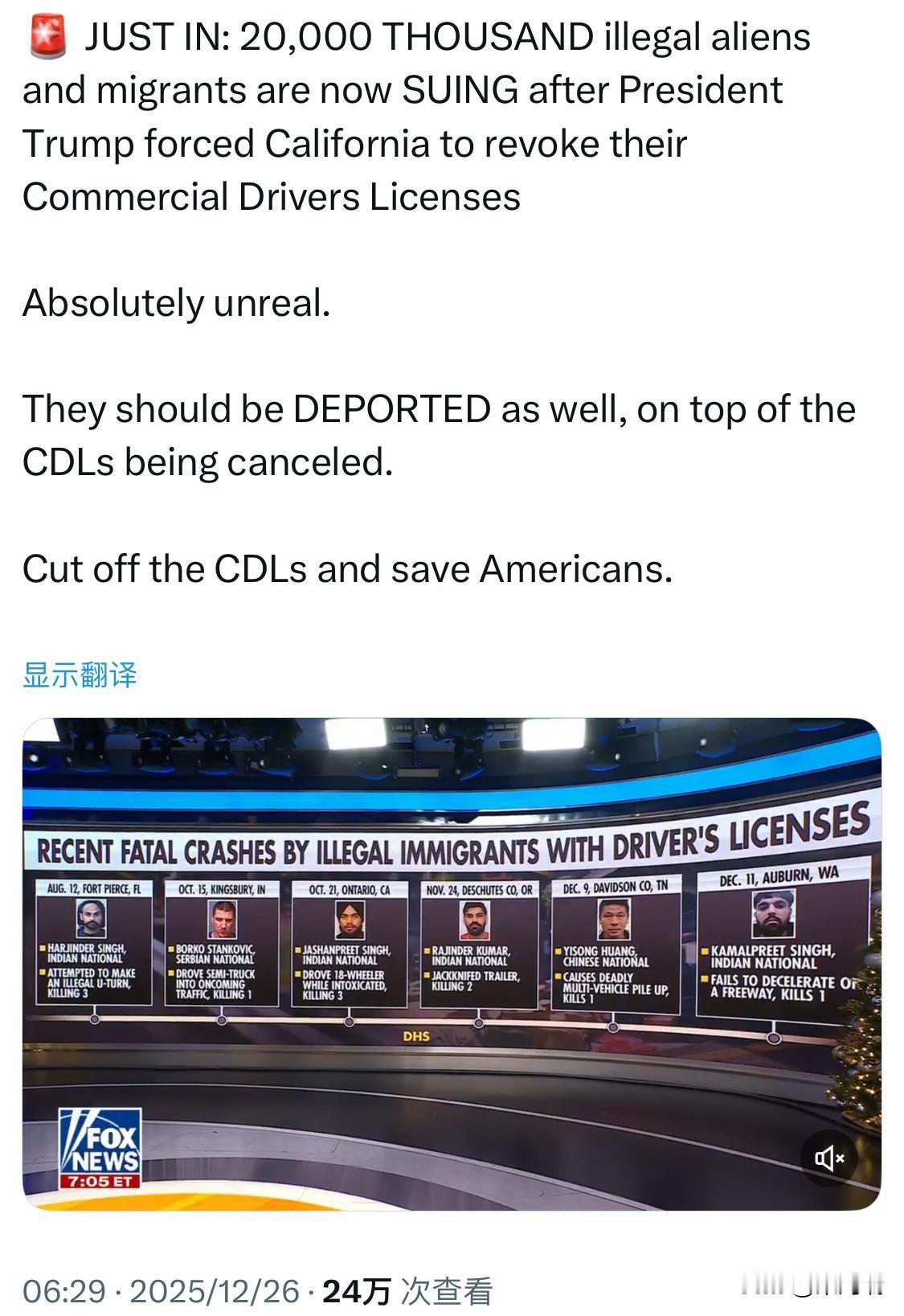在特朗普政府的压力和联邦资金(最高达 1.6 亿美元)被扣押的威胁下,加利福尼亚州车管局(DMV)采取行动,计划从 2026 年 1 月 5 日起吊销约 21,000 名移民的商业驾驶执照(CDL)。 联邦政府认为加州发放的这些驾照有效期超出了持有者的合法居留或工作许可期限,违反了联邦安全和移民法规。 2025 年 8 月,一名持有加州 CDL 的非法入境司机在佛罗里达州发生致命车祸,导致三人死亡。此后,联邦政府加强了对移民商业卡车司机的审查。 诉讼情况: 2025 年 12 月 23 日,受影响的移民司机正式向加州法院提起集体诉讼,旨在阻止 DMV 吊销其执照。 原告方:该诉讼由亚裔法律核心小组 (Asian Law Caucus)、锡克教联盟 (Sikh Coalition) 以及五名具体的移民商业司机代表提出。 核心主张: 违反程序正义:原告指控 DMV 在没有充分通知或正当程序的情况下撤销执照,违反了州法律和正当程序。 合法身份争议:加州州长办公室和原告辩称,受影响的司机最初获得驾照时均持有有效的联邦工作许可,吊销行为是出于政治压力而非实际法律违规。 生计与供应链影响:诉讼指出,此次大规模吊销将导致大范围失业,并威胁到依赖这些司机的供应链稳定。 目前,该案正在阿拉米达县高等法院审理中,原告已请求法院发布紧急延期令,以防止执照在 2026 年 1 月失效。此外,哥伦比亚特区联邦巡回上诉法院已在 2025 年 11 月发布临时禁令,暂停了特朗普政府针对寻求庇护者和 DACA 受惠者的相关全国性规则。