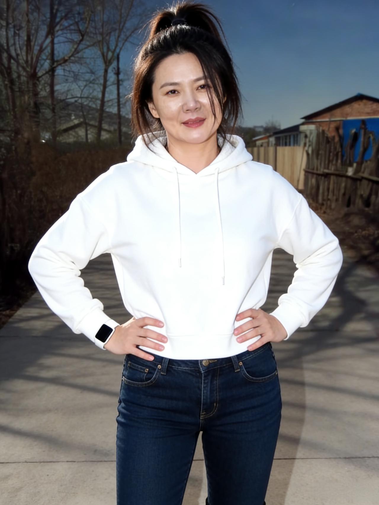 倩影徘徊野径旁,风拂青丝沐月光。 不借丹青描秀色,中年风骨压群芳。