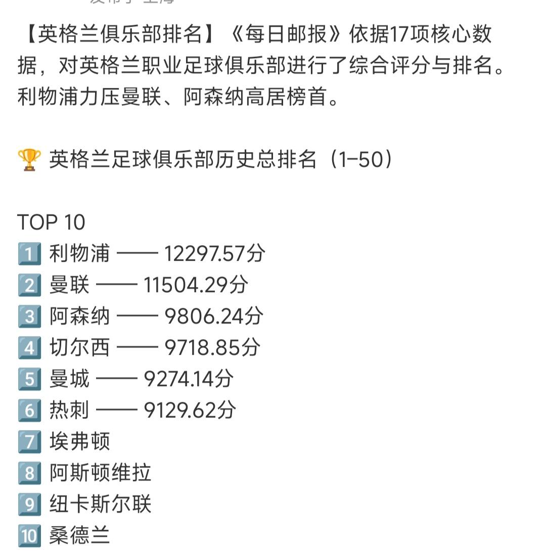 英格兰历史第一俱乐部是利物浦。 第二俱乐部是曼联,这两领先群雄, 阿森纳第三,切尔西第四,曼城升到第五。 这是英国每日邮报综合评分的,英超竞争激烈,未来肯定会有变化![可怜][灵光一闪]