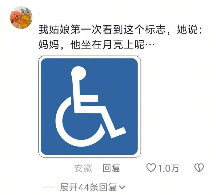 我姑娘第一次看到这个标志,她说:妈妈,他坐在月亮上呢...