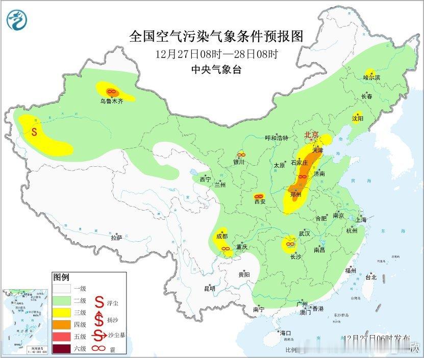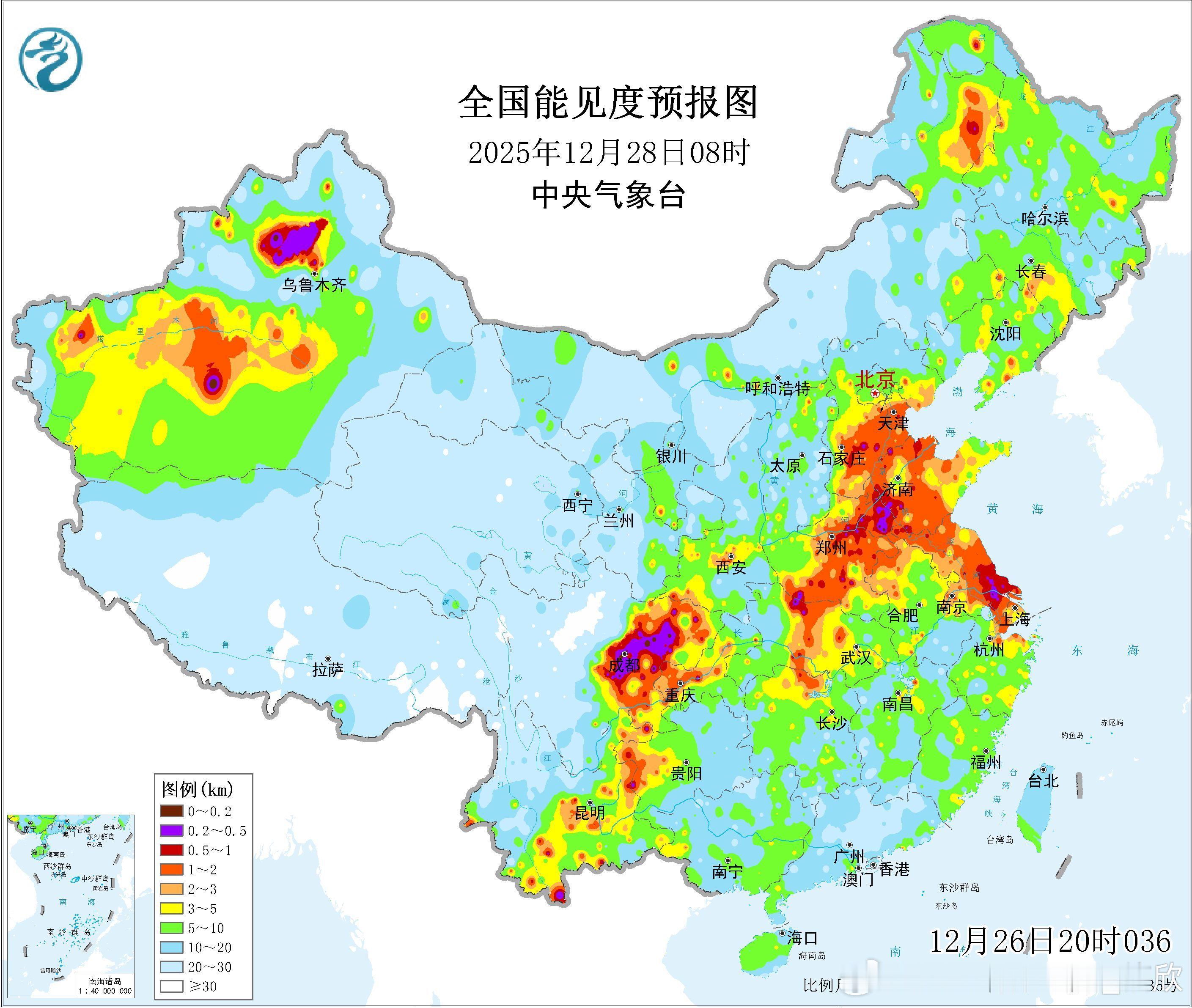 【雾和霾】今晨四川盆地等地出现大雾。8时部分站点能见度不足100米,比如四川巴中61米、蓬安72米、渠县74米、湖北竹山71米。目前看,明晨除了四川盆地、河北河南山东江苏的雾也可能会发展增多。从空气质量看,今晨河南、河北南部一带,出现了轻度污染,有霾。今明持续,29日冷空气到来后,霾向南传输、减弱。