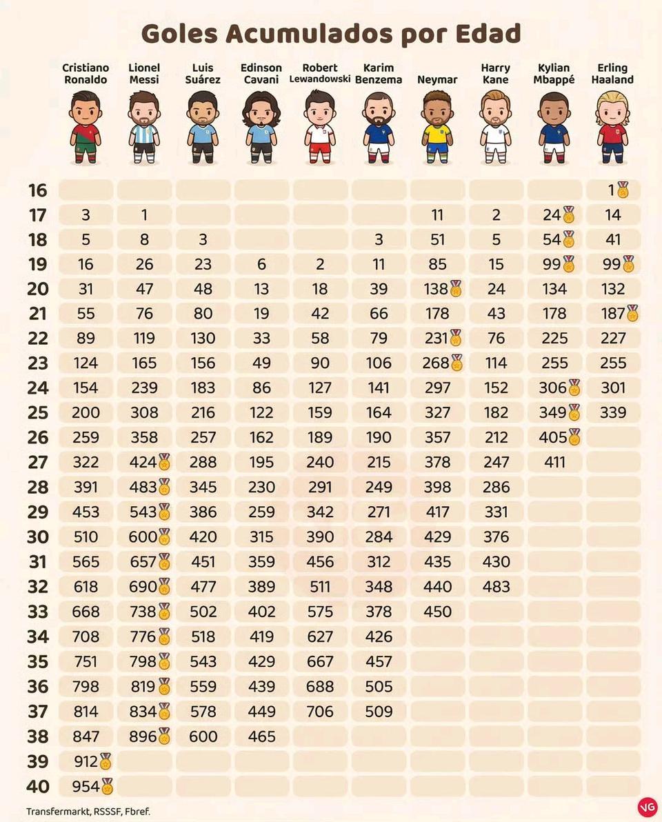 这张图是足坛巨星在各年龄阶段的进球数。 C罗17岁打进3球,18岁打进5球,现在40岁打进954球。 梅西17岁1球,现在38岁打进896球。 苏亚雷斯至今600球。 现任两大球王姆巴佩16岁没进球,哈兰德16岁打进1球,这两人正在追赶梅罗![灵光一闪]