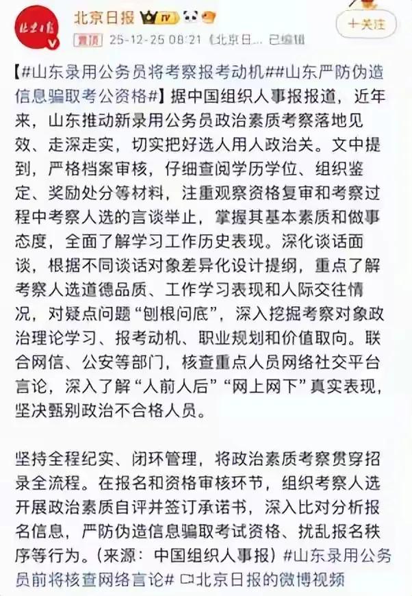 如果你打算报考公务员,以后在网络上要小心了! 山东已经开始实行在公务员录用政审环节,要求调查本人在网络上的表现。说白了,这就意味着如果你之前在网络上发表过不当言行,一旦被调查出来,就有可能面临着政审环节不过关,眼看即将到手的公务员也就废了。 进入公务员录用的政审环节,通常也就是最后一个环节了,如果政审过关,接下来就只有公示。正常情况下,如果没有任何违法乱纪行为公示,这一关就是走走过场,不会有任何问题。所以一旦通过政审,也就意味着公务员考试上岸了。 以前公务员政审是不会审查被考察人在网络上的表现的,除非及个别人因为在网络上有严重违法违规行为被全网曝光过,否则一般人的网络言论是不会被调查的。但是山东现在的这个做法已经开启了这个方面的先例,接下来有可能会在全国推广。 所以那些想考公务员的网友,你们在网络上的言行千万要注意,不要再随心所欲胡说八道,甚至违反相关法律法规。在政审环节才被刷下来,的确是太可惜审。