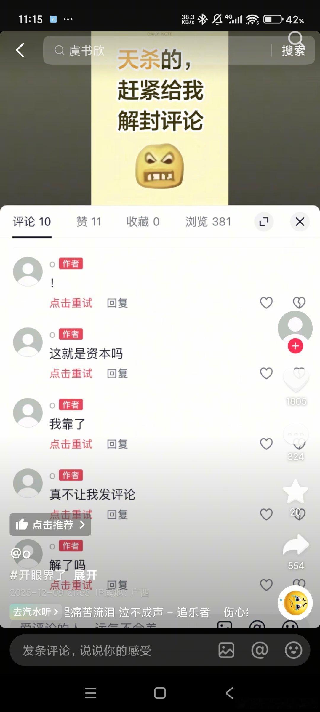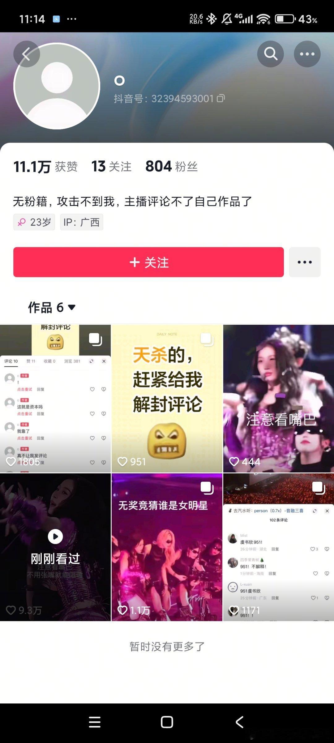 以前我一直都以为抖音灰色头像就是号没了是开玩笑的,直到刷到了一个说虞书欣假唱的,前一秒视频还在,点进主页看了下视频就没了,人也封了