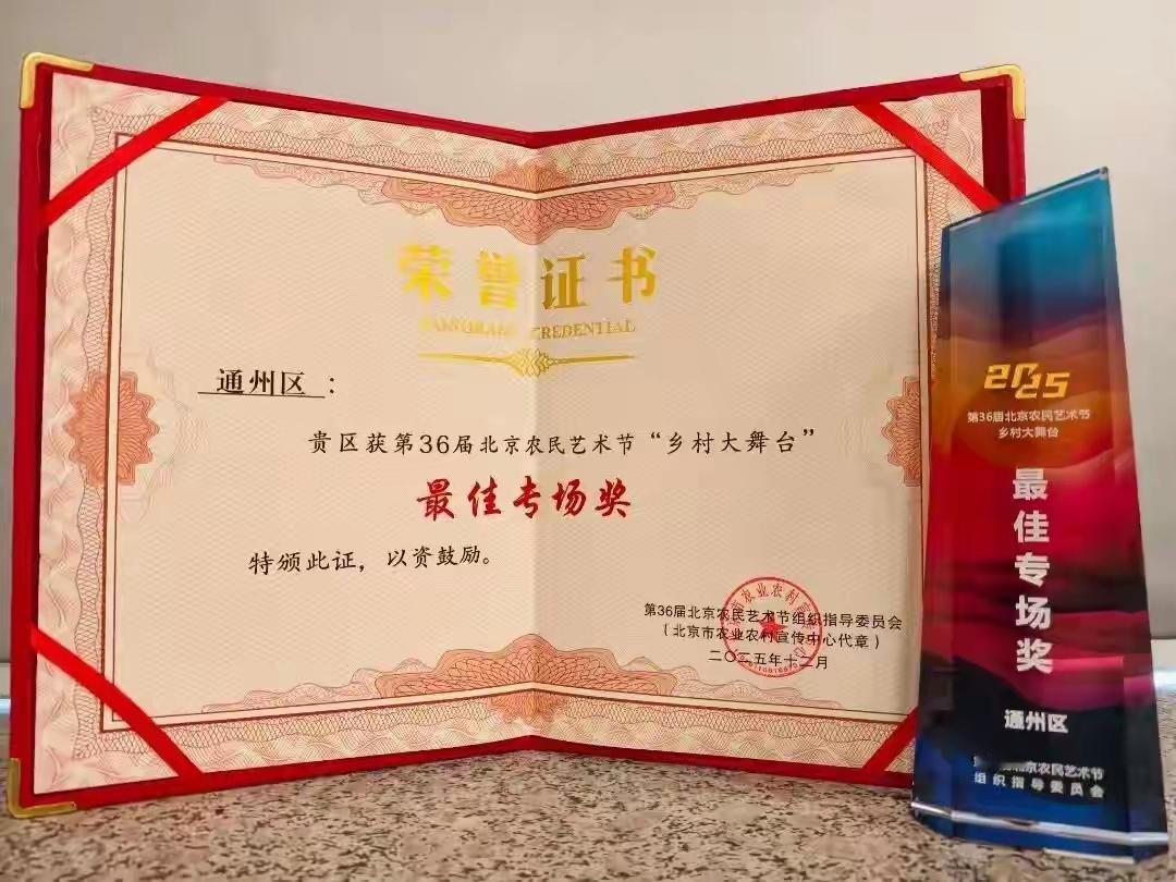12月24日,第36届北京农民艺术节总结交流研讨会在通州区宋庄镇落幕,通州区专场展演荣获“最佳专场奖”。这次展演坚持“以农民为主体、艺术为媒介”,将大运河文化与乡村活力融合,通过多元形式展现新时代农民风貌。 同时,原创音乐作品《水稳号儿不急》入选优秀节目汇演,生动描绘通州人民建设家乡的图景。2024年通州“三农”成果也很亮眼,粮食播种面积约17.5万亩,同比增长约14%。未来,通州区还会持续擦亮农民“两节”文化品牌,推进农文旅体商深度融合。 北京农民艺术节 通州艺术节