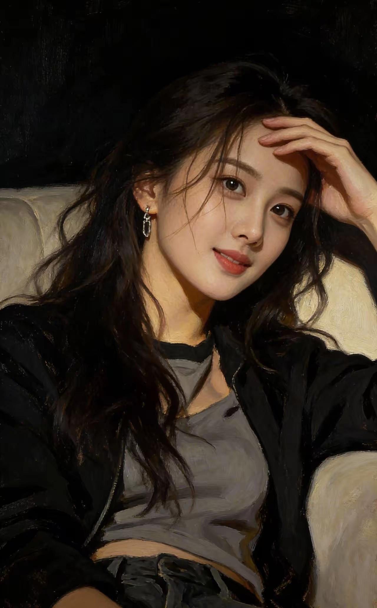 慵懒午后,黑发少女轻抚发梢,微笑如春日暖阳。