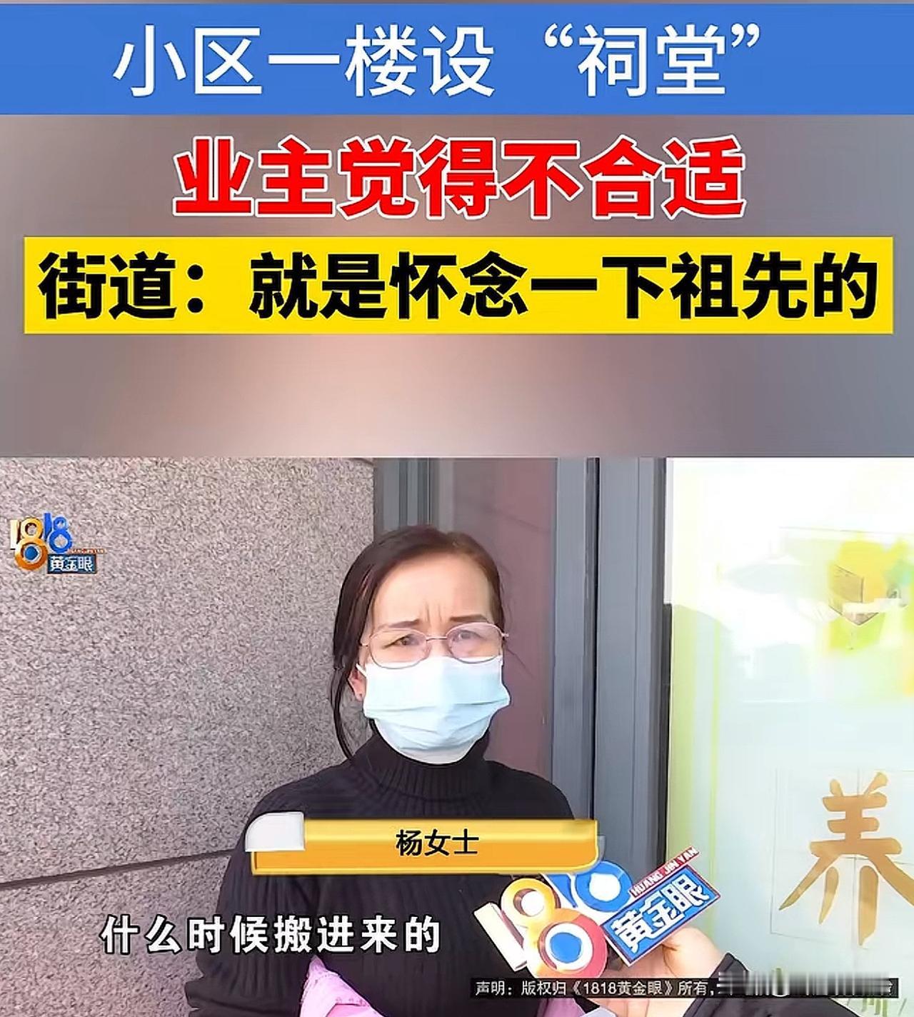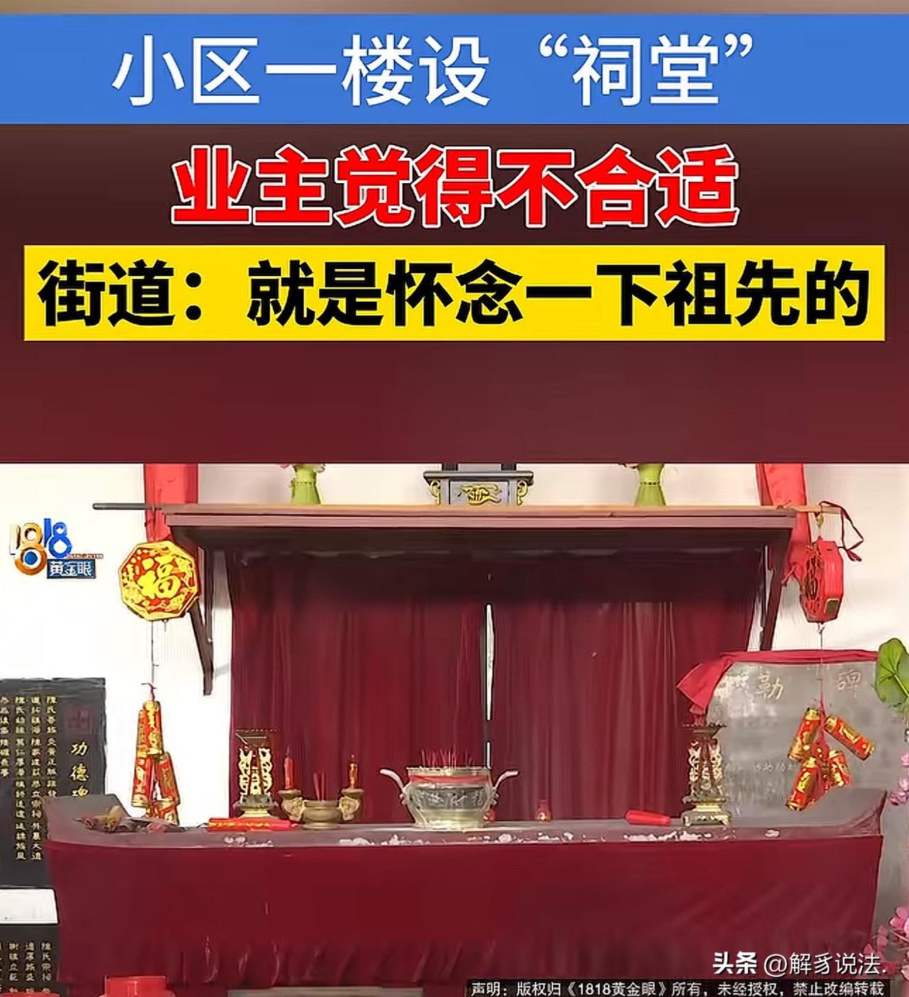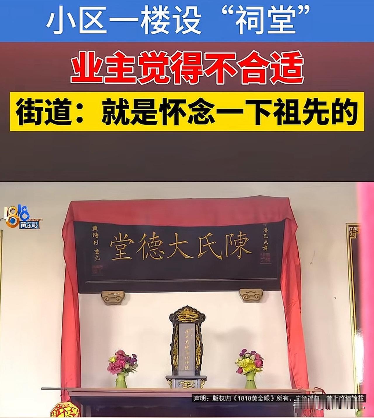 浙江宁波,女子一直以为自家楼下的3间商铺开的是医馆,后来她发现不对劲了,商铺里面不仅有牌位,还有人过来祭祖,才知道开设的是祠堂。女子不干了,认为这个地方人来人往,将祠堂开设在这里,影响自己的生活,于是,找到街道讨要说法。街道负责人称,就是祭拜一下祖先,没搞白事等封建迷信活动。女子对此还是不能接受,找来媒体曝光此事,让网友给评评理。 杨女士家住在朱家苑小区,这是一个交付十多年的回迁安置小区,平日里她在这儿住得舒心又安稳,可一次意外的发现,却让她心生不安起来。 一直以来,杨女士都以为一楼的三间商铺,开的是一家医馆。 就在今年冬至,她发现不对劲了,有人先后带着水果等物品进到该店铺里面。 杨女士好奇,就趴在门口向里面瞅了一眼,这不瞧不知道,一瞧吓一跳,原来,里面根本不是医馆,而是个祠堂。 杨女士不干了,认为这里正好临街,人来人往,将祠堂开设在这里,完全没考虑到其他业主的感受,她找到街道讨要说法。 街道负责人却认为杨女士太矫情了,没必要过分在意。 杨女士一气之下,找来媒体曝光此事,让网友给评评理。 记者跟随杨女士来到该祠堂,只见门头上挂着“大德世家”的招牌,玻璃门上还贴着不少尊老爱老的宣传标语。 无奈大门紧闭,窗帘也拉得严严实实,记者透过门缝进行拍摄。 屋子正中间端端正正挂着一块“陈氏大德堂”的牌匾,牌匾下方赫然立着“陈氏大德始祖神位”,神位前还整整齐齐摆放着香台、蜡烛这类祭祖用的物件。 看来杨女士所言非虚,记者为了进一步了解情况,联系上了街道负责人。 负责人告诉记者,朱家苑小区当初是五个村子拆迁后合并安置的小区,其中连城村的村民大多姓陈。 当年拆迁的时候,陈氏宗祠也在拆迁范围内,宗祠里不光存放着陈氏一族的历史沿革资料,还有不少陈氏名人的事迹记载。 这些都是老祖宗留下来的东西,村民们舍不得丢,就一起把这些资料搬到了朱家苑小区,还专门立了一块碑,详细说明了拆迁搬迁的缘由。 负责人还特意强调:祠堂内里面没摆乱七八糟的牌位,也没搞什么经营性的白事活动,更没有封建迷信那一套。平日里这屋子基本不开门,也就是每年冬至的时候,陈氏的后人过来祭拜一下祖先,缅怀缅怀先人。而且屋子里的墙上,还挂满了陈家的家风家训,说白了,就跟咱们清明节在家里祭拜祖先一样,就是个怀念先人的仪式,绝对没有什么出格的行为。 街道负责人的话听着好像挺有道理,但杨女士还是没法认同。 在她看来,不管祠堂里头有没有搞别的活动,单是建在小区一楼这个位置,就压根不合适。 楼上住着几百户业主,门口又是车水马龙的大马路,这么个人来人往的热闹地方,突然冒出个祠堂,换谁心里都不踏实。 此事曝光后,网友给出了不同看法:都住拆迁安置房了,就不要过场多了!再说了,每个家庭,家族,都有祖先,有啥子嘛。又不是楼底下是火葬场!人正不怕影子歪! 族里有祠堂不是很正常吗? 拆迁了放在安置房,说实话说明这个族还蛮有凝聚力的。 《民法典》第271条规定:业主对建筑物内的专有部分享有所有权,但行使权利不得危及建筑物安全,不得损害其他业主的合法权益。 在本案中,即便陈氏族人拥有这三间商铺的使用权,也不能随心所欲地将其改作祠堂。 如果杨女士发现该祠堂确实影响到自己和其他业主的日常生活,完全可以向相关部门举证维权,比如祠堂祭祀活动产生的噪音、香火异味,以及祭祀人员往来对小区公共区域使用体验造成的影响等,都可以作为具体的举证内容。 《民法典》第278条规定:改变共有部分的用途、利用共有部分从事经营性活动等事项,应当经参与表决专有部分面积四分之三以上的业主且参与表决人数四分之三以上的业主同意。 小区一楼的公共通道和门前区域,都属于全体业主共有的地方。 祠堂设立之后,族人祭拜时会在这些区域通行、停留,这其实就改变了共有部分的原本用途。 这种事可不能只由陈氏族人和街道单方面说了算,必须征求小区全体业主的意见,并且达到法律规定的同意比例,这也是保障所有业主共同管理权的关键所在。 这件事的核心争议,其实就是祠堂的设立有没有办齐合法手续,有没有征求过全体业主的意见。