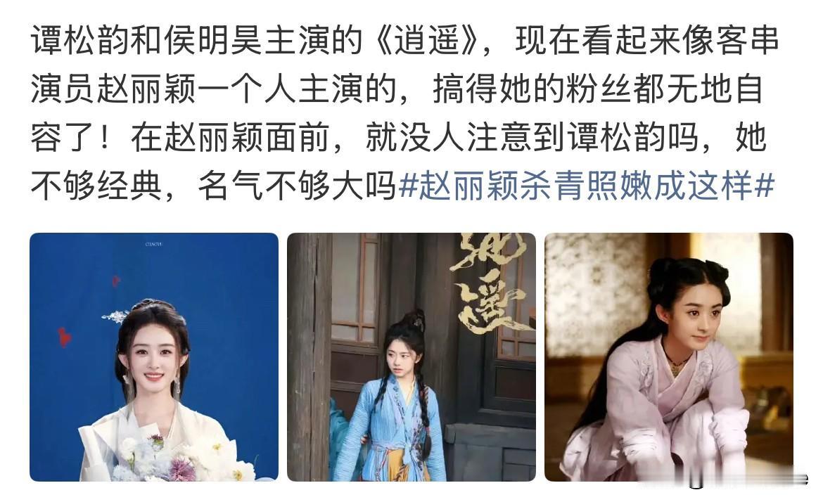 12月27日,赵丽颖出演《逍遥》引争议 谭松韵出道20年,侯明昊出道10年,都不是内娱新人,片方一味宣传赵丽颖,不仅给赵丽颖带来无端争议,显露片方对两位主演扛剧没有信心,对自己导出来的作品没有信心! 片方把赵丽颖当宣传的最大噱头,让人忽视了男女主的存在,让人潜意识否认男女主的抗剧能力,以及对他们的期待…… 这部剧火了,算赵丽颖的成绩么?这部剧没火,算谭松韵侯明昊成绩么? 赵丽颖出演只是与导演的十年情分,不能完全靠她来做这部剧的热度!
