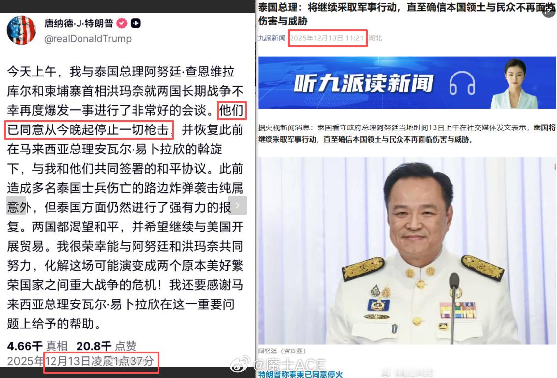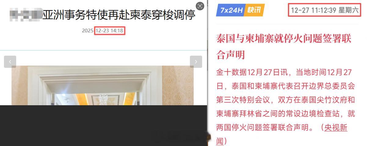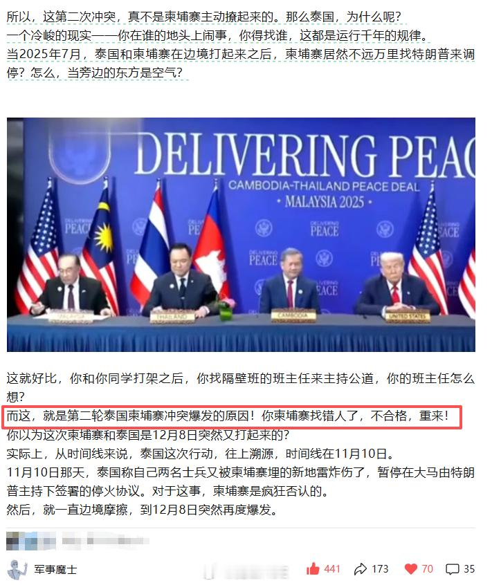 泰柬签署停火联合声明烽火问鼎计划热点现场 看吧,泰国柬埔寨,找对了人,就能停战了。就在柬埔寨和泰国的这第二次冲突刚开打的时候,我就写文提过了,第二次开打的一个原因之一,就是当时柬埔寨找错了,自己和同班同学打架,找别的班主任来管,自己班主任怎么想?姿势不对,重来!其他的原因,就是泰国要大选了拉选票支持率,同时得到东方默许打击电诈。在这个合力下促成了第二次泰柬战争。所以,这次柬埔寨挨打之后,柬埔寨渴望的表态是等了一个多月才等到。12月13日的时候,特朗普那个时候就放空炮,喊自己已经调停成功,今晚柬埔寨和泰国就将停火。结果第二天天一亮,泰国总理阿努廷就发话,将继续进行军事行动直到柬埔寨没有威胁。笑死,把老川子的脸往肿里扇。故意让特朗普来献这一次丑来的。老川子献丑完毕,就轮到真正的主角上场表演了。23日特使斡旋,26日开始谈判,27日双方正式宣布停火。千年稳固的逻辑与道理——在什么地头上,要办什么事,得找到对的人。