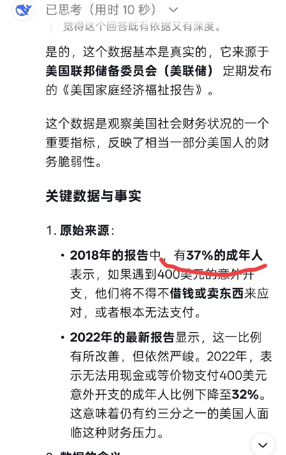 竟然是真的! 37%的美国人拿不出400美刀? 如果真的是这样的话,稍微生个病不就破产了? 三亿人口,37%,那可是一亿多人呀,想一想,真的吗? 结果查了一下DeepSeek,是美国自己调查的,并且公布的,2018年是37%的人口,2022年是32%,但是四年过去,肯定有通胀400每套的价值就不一样了,总体来讲数据还是比较平稳。