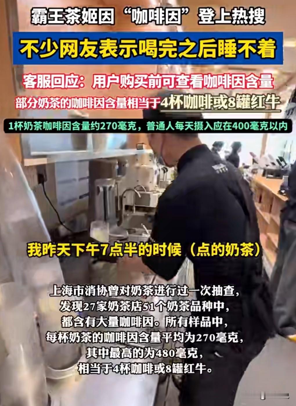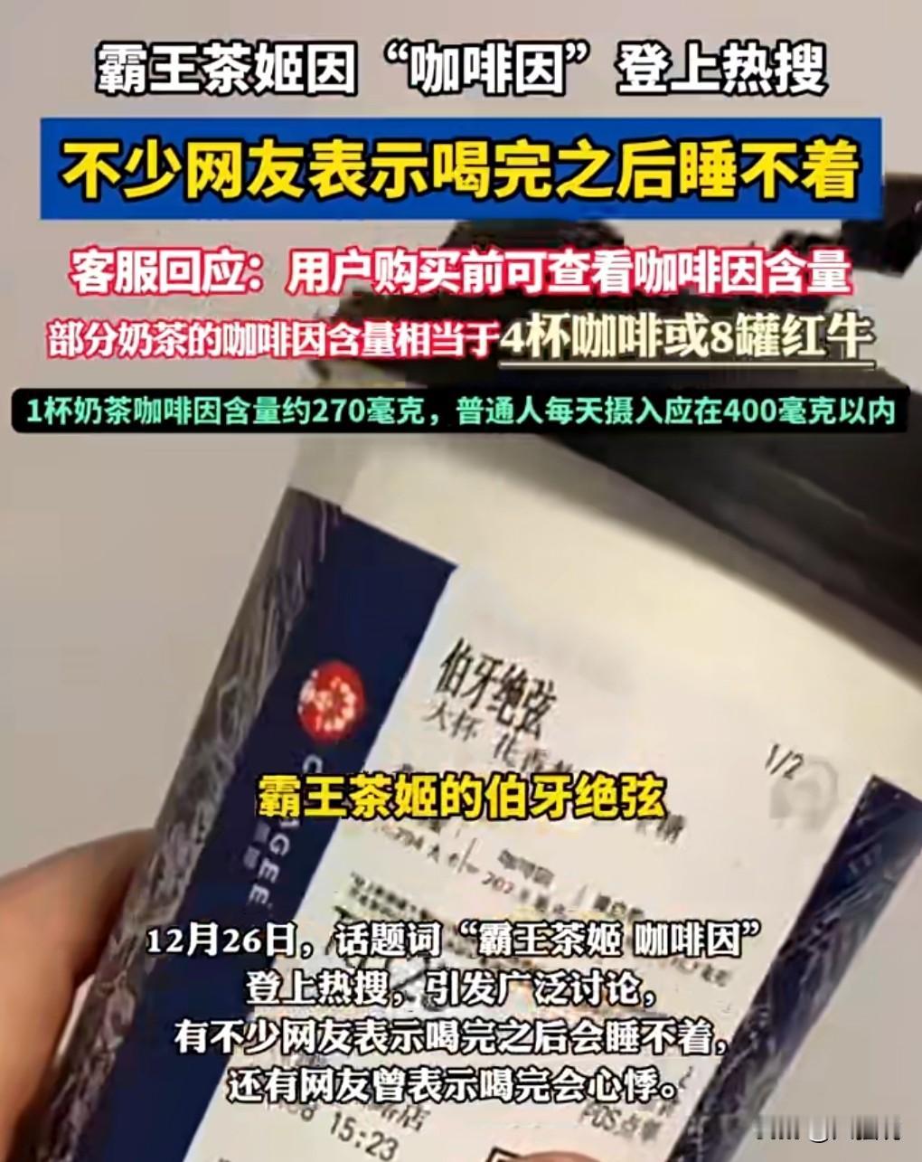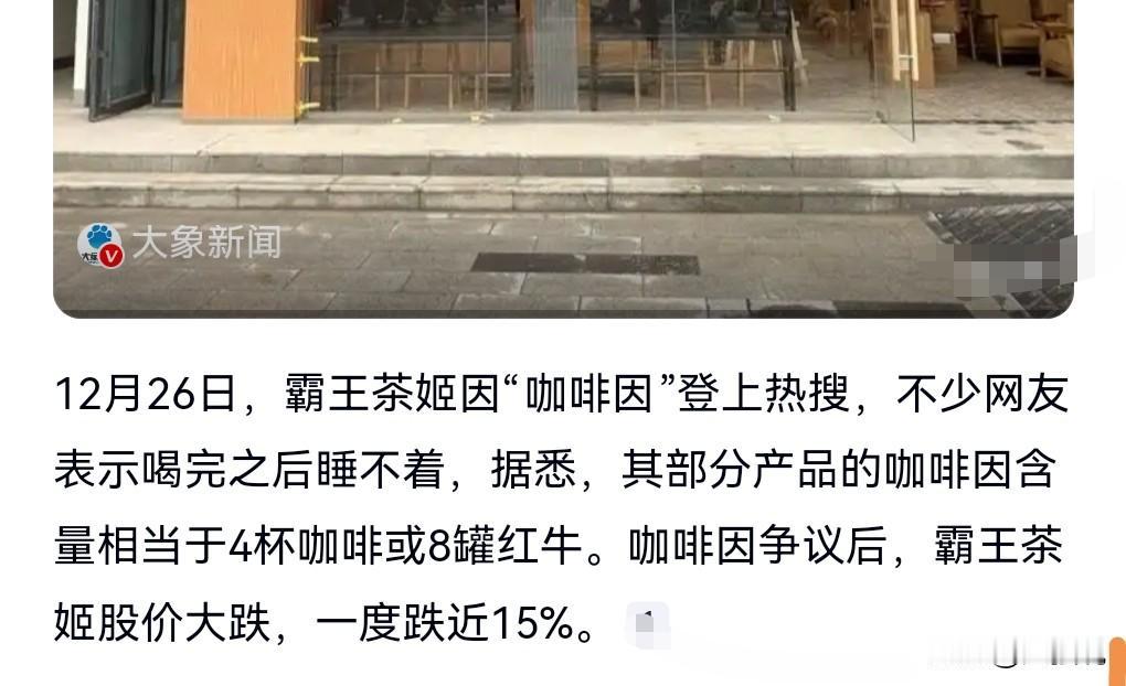 真是敲响了警钟啊。 12月26日,霸王茶姬因咖啡因登上热搜。 那个奶茶里面怎么还有这么多咖啡因呢?比咖啡含的咖啡因还多,这真是超出了我的认知啊。 霸王茶姬大跌,一度跌近15%。 原因是里面的咖啡因含量太多了,有人说喝了睡不着,有的还心悸。 这样的消息一出来,霸王茶姬不跌才怪。 部分奶茶的咖啡因含量竟然相当于4杯咖啡或八罐红牛。