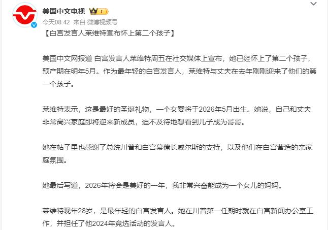 发言人卡罗琳·莱维特传来喜讯! 12月27日,有网友晒出发言人卡罗琳·莱维特宣布怀孕的消息,还晒出她在圣诞树前挺着大肚子的画面,画面中,卡罗琳·莱维特身穿白色毛衣裙子,肚子已经微微隆起,估计怎么也有四个月以上了。另外她还晒出婴儿B超的画面,小家伙躺在妈妈的肚子里非常安静,四肢还有脑袋已经成形了,这也是发言人卡罗琳·莱维特今年最大的幸福了吧! 据悉发言人卡罗琳·莱维特不仅颜值高,还口齿伶俐,是一位非常优秀的女强人。还是美国历史上最年轻的总统新闻秘书。在家庭方面,她的老公比她大很多,还和比她年长32岁的老公有一个儿子。不知道这次卡罗琳·莱维特是女孩还是男孩,要是女孩的话估计他们会更加美满了。