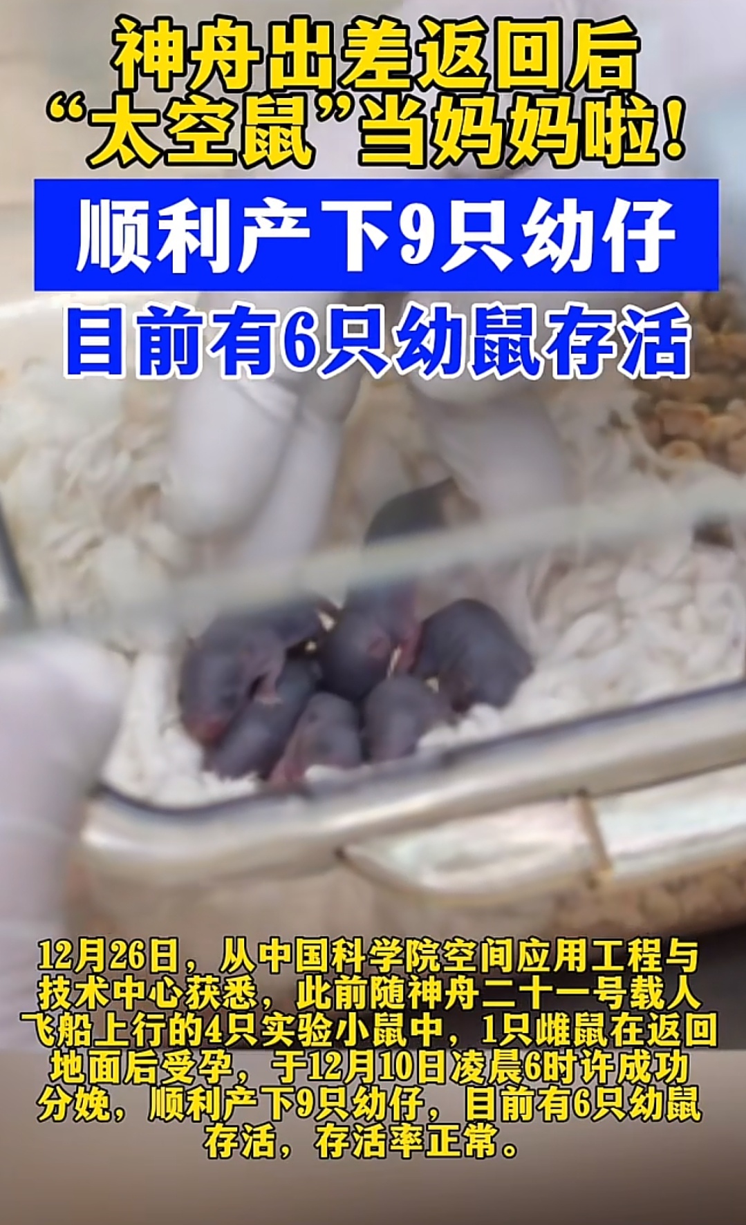 中国太空鼠产下一窝小鼠【上空间站的太空鼠鼠生一窝宝宝】此前随神舟二十一号载人飞船上行的4只实验小鼠中,1只雌鼠在返回地面后受孕,于10日成功分娩,产下9只幼仔,目前有6只幼鼠存活,存活率正常。目前,“太空小鼠后代”正在科研人员的精心呵护下茁壮成长,母鼠哺育行为正常,幼仔活力良好。此次任务证明短期空间飞行未对小鼠的生育能力产生负面影响,同时也为研究空间环境对哺乳动物生命早期发育的影响提供了极其珍贵的样本。对于这批由太空返回小鼠孕育的子代,科学家将持续开展系统性研究,重点关注其生长发育曲线、生理与病理特征的变化。此外,科学家还将进一步观察子代的繁殖能力,尝试获得“子二代”小鼠,以深入探讨太空环境对哺乳动物多代遗传和发育的潜在影响。(央视新闻)
