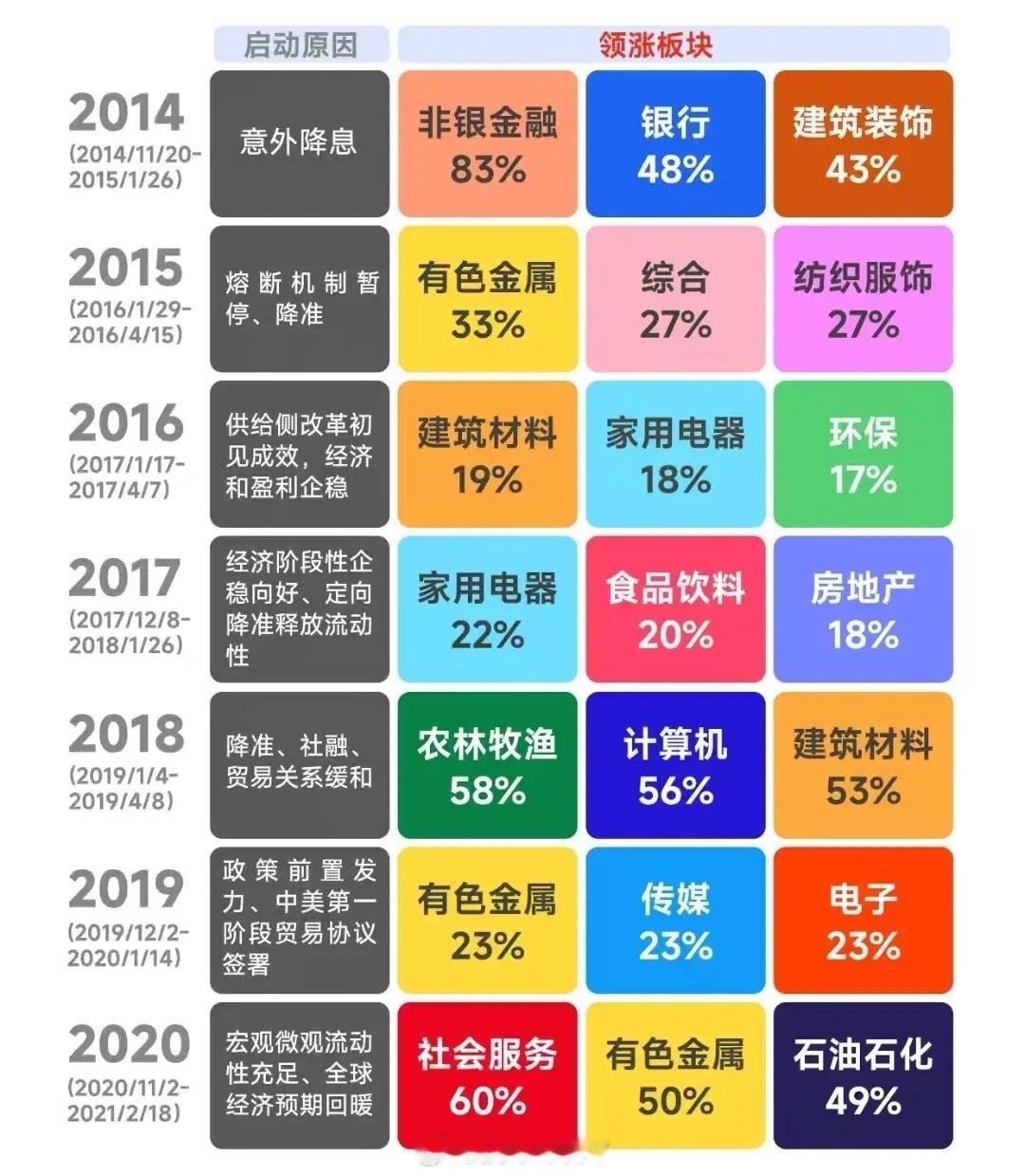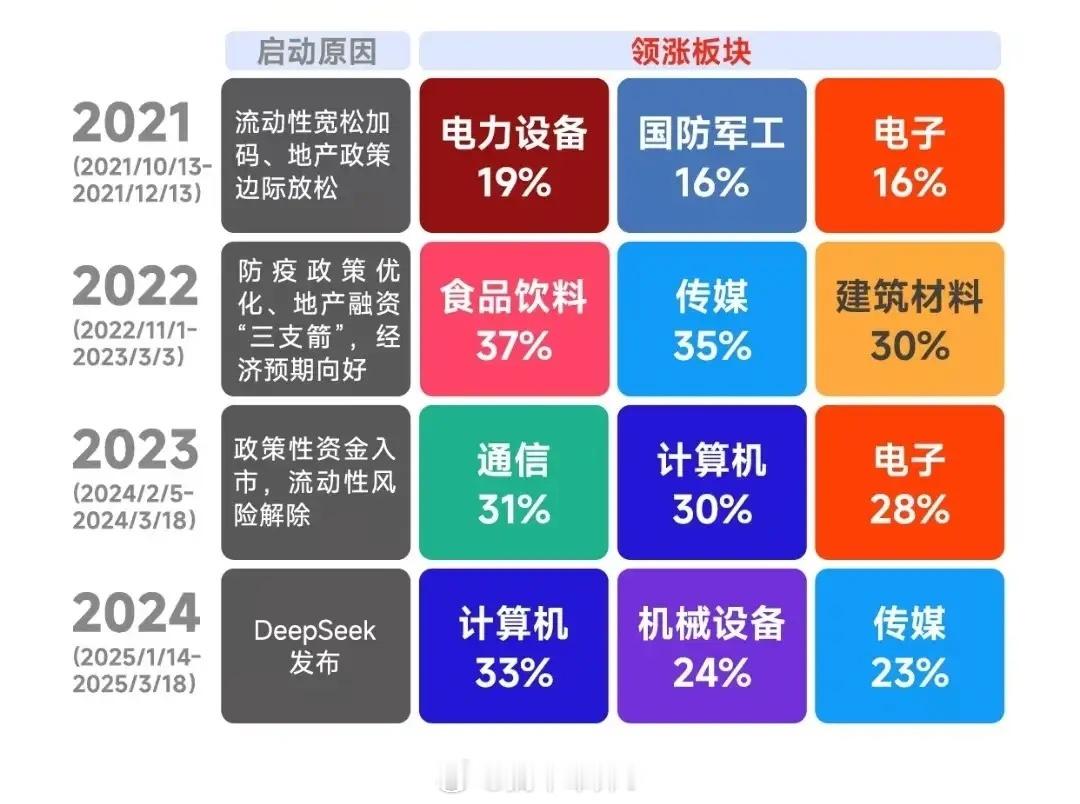 近十七年跨年主线逻辑分析!跨年行情会不会历史重演?17年跨年行情数据大起底!谁是真正的常胜板块?从2008到2013年,每一轮跨年行情都有明确的启动逻辑,政策、企业盈利、货币宽松等因素轮番主导,建筑材料、有色金属、国防军工等板块也曾轮番领涨,涨幅最高甚至突破100%。2021年流动性宽松与地产政策边际放松,推动电力设备板块领涨;2022年防疫政策优化、地产融资“三支箭”落地,食品饮料、传媒板块涨幅超30%;2023年政策性资金入市,通信、计算机等科技板块成为主角;2024年DeepSeek发布,再度点燃计算机板块热度,机械设备、传媒紧随其后……十七年的板块轮动与驱动逻辑,藏着跨年行情的底层密码,看懂历史,或许就能摸到当下的市场脉络~