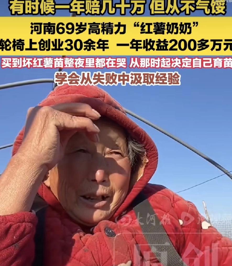 69岁坐轮椅,一年赚200万?河南这位奶奶,真把日子过成了励志剧! 别人眼里的养老年纪,李小稳奶奶却每天早上5点就摇着轮椅下地了。30多年了,那辆旧轮椅碾过的田埂,比很多人走过的路还长。 一开始谁信啊?行动不便,偏要搞红薯育苗。买到了坏苗子,整夜整夜哭,擦干眼泪干脆自己学育苗。失败了再来,愣是培育出高产好品种。 如今年收益200多万,光工人工资就发60万,带着50多户乡亲一起干。她说:“赔过几十万,但没想过放弃。” 这才是真正“大女主”——不抱怨命,不服输,把烂牌打出王炸。网友说得对:强者从不为困难找借口,只为成功找方法。 啥叫活得精彩?看看红薯奶奶就懂了:人生下半场,照样能折腾出满地红薯香。 轮椅上的老太太