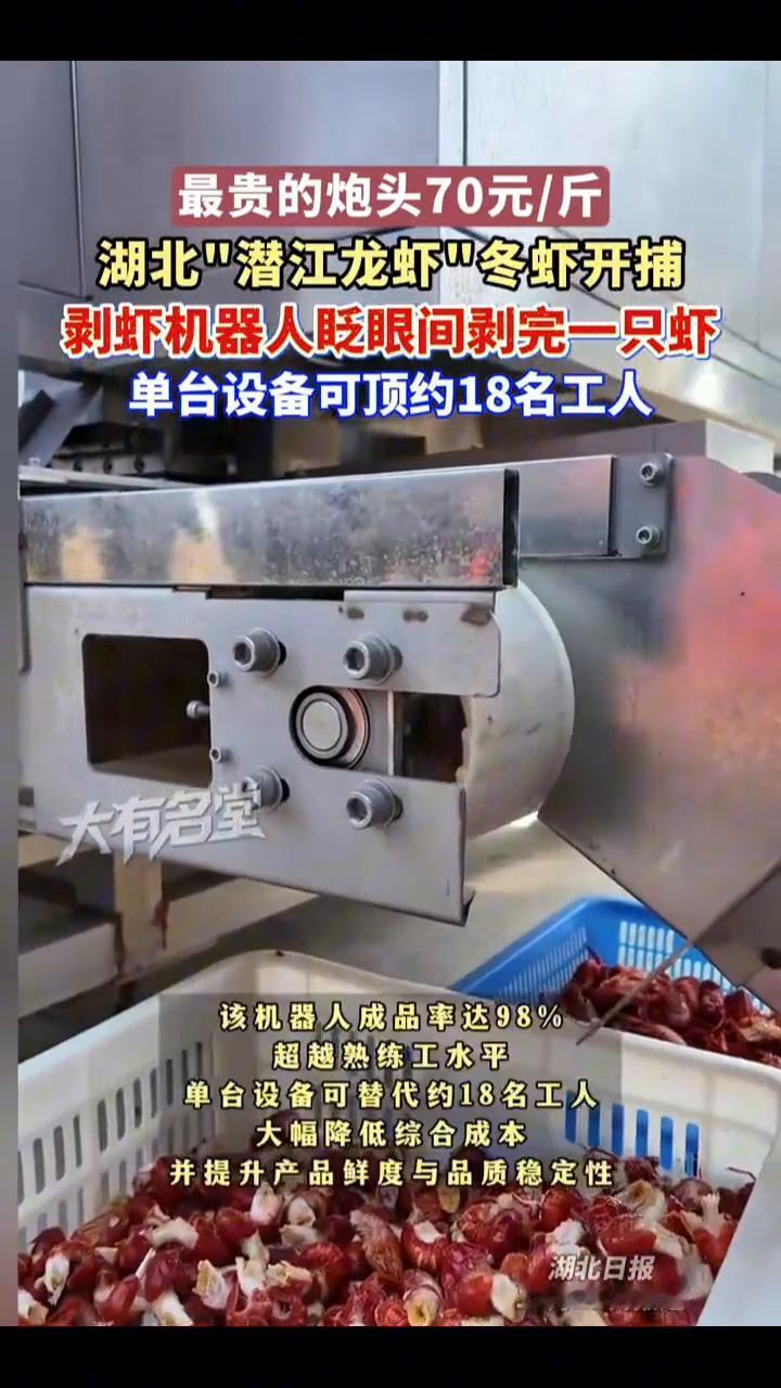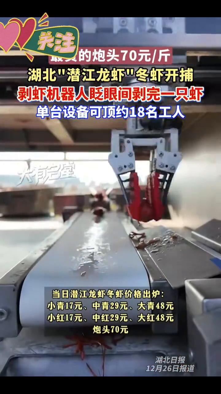 湖北"潜江龙虾"冬虾开捕,剥虾机器人眨眼间剥完一只虾,单台设备可顶约18名工人。 湖北日报。 12月26日,2025年湖北"潜江龙虾"冬虾开捕仪式在潜江市龙湾镇郑家湖"四季有虾"养殖基地启动。当日潜江龙虾冬虾价格出炉:小青17元、中青29元、大青48元、小红17元、中红29元、大红48元、炮头70元。 冬捕活动现场,一台能自动剥小龙虾的机器引起围观。这是湖北省睿峰智控设备制造有限责任公司开发的剥虾机器人,可精准抓虾,AI视觉识别,仿生手旋扭分离,全程仅1.7秒,超越熟练工水平。单台设备可替代约18名工人,大幅降低综合成本,并提升产品鲜度与品质稳定性。