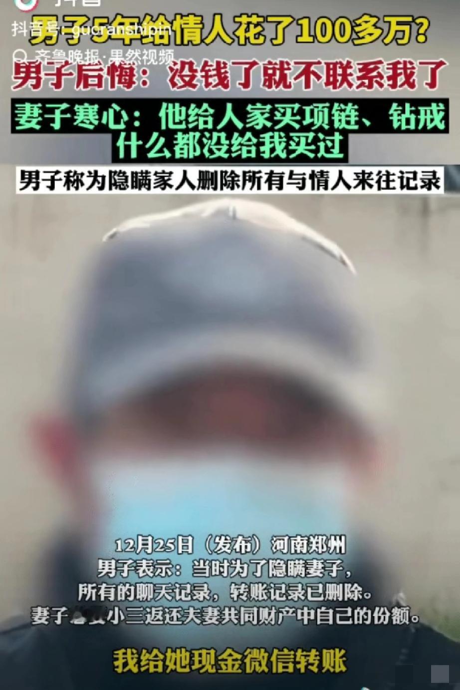 果然,男人只有挂到墙上才老实!河南,五旬大叔,找了个小三,两人在一起5年,大叔看上小三长得漂亮,声音好听,禁不住诱惑,给小三不是买钻戒,就是微信转账,偶尔还给现金。 等到钱花光、自己病倒,小三立马删联系方式跑路,这才想起回头求老婆原谅,简直离谱到极致。更蠢的是,当初为掩人耳目删光聊天和转账记录,以为能瞒天过海,却忘了法律从不会惯着这种违背公序良俗的事。 其实删了记录也能维权,银行流水、支付平台账单都能查到痕迹,实在不行还能申请调查令调取证据,婚内擅自处分共同财产的赠与本就无效。最该夸的是原配,没只顾着哭闹,而是果断找记者、走法律途径要回属于自己的东西。 背叛婚姻的人终会被反噬,算计别人的也迟早栽跟头。你们觉得这100万能成功追回吗?如果是你遇到这种事,会怎么处理?