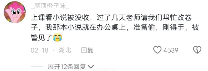 上课看小说被没收,过了几天老师请我们帮忙改卷子,我那本小说就在办公桌上,准备偷,刚得手,被瞥见了