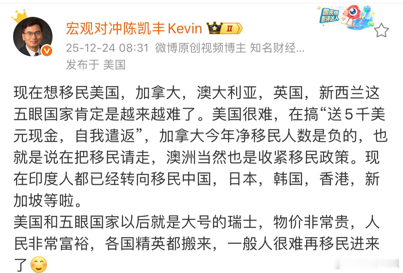 张嘴就来,除了美国,所有英联邦国家都不排斥华人移民,新西兰还放松了移民政策,不是去不了国外,是已经有了绿卡的人都纷纷回国了,正经赚得合法钱的人并不一定要移民!国内的生活便捷性更好,五眼国家是真的落后啦。在国外生活过吗?这些国家人民非常富裕?扯蛋!他们大部分没钱,租房子住,月月光!