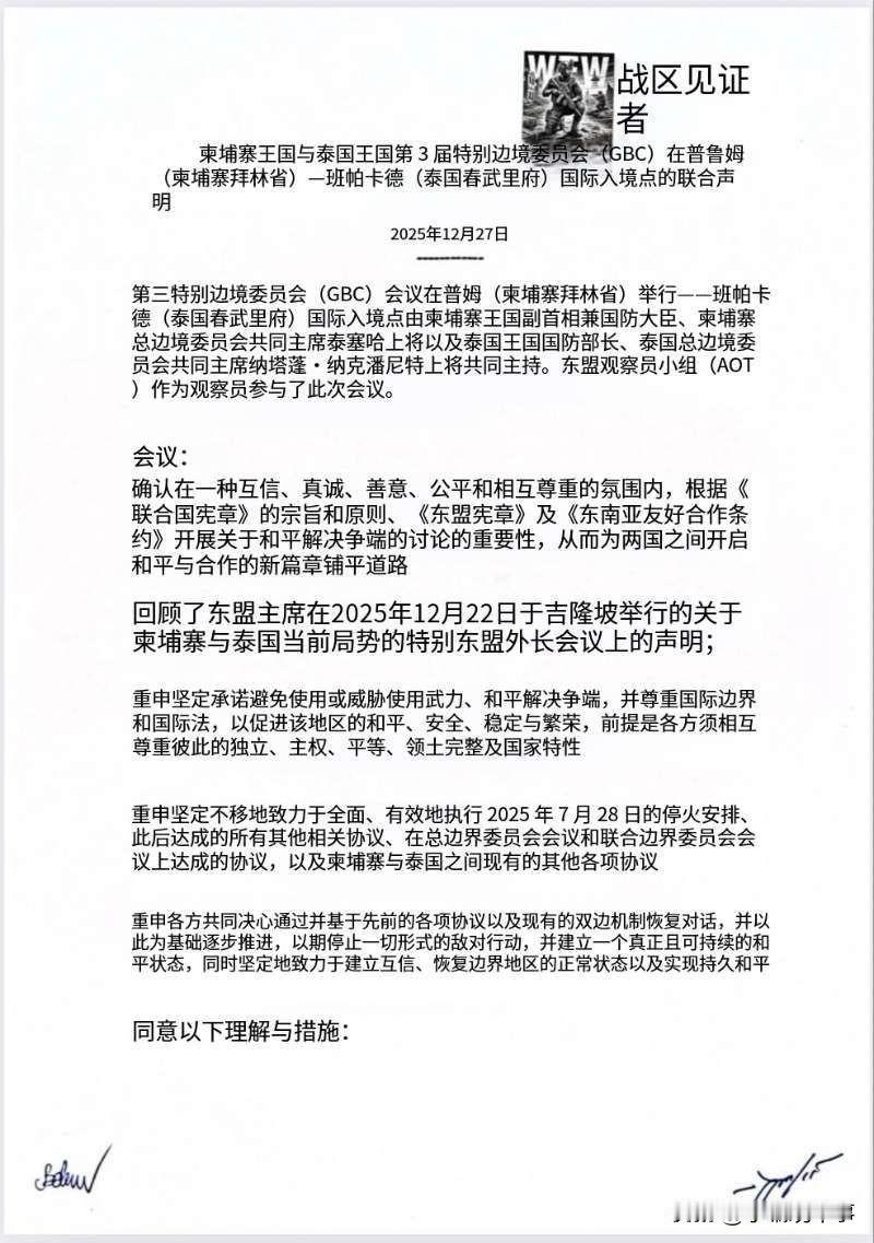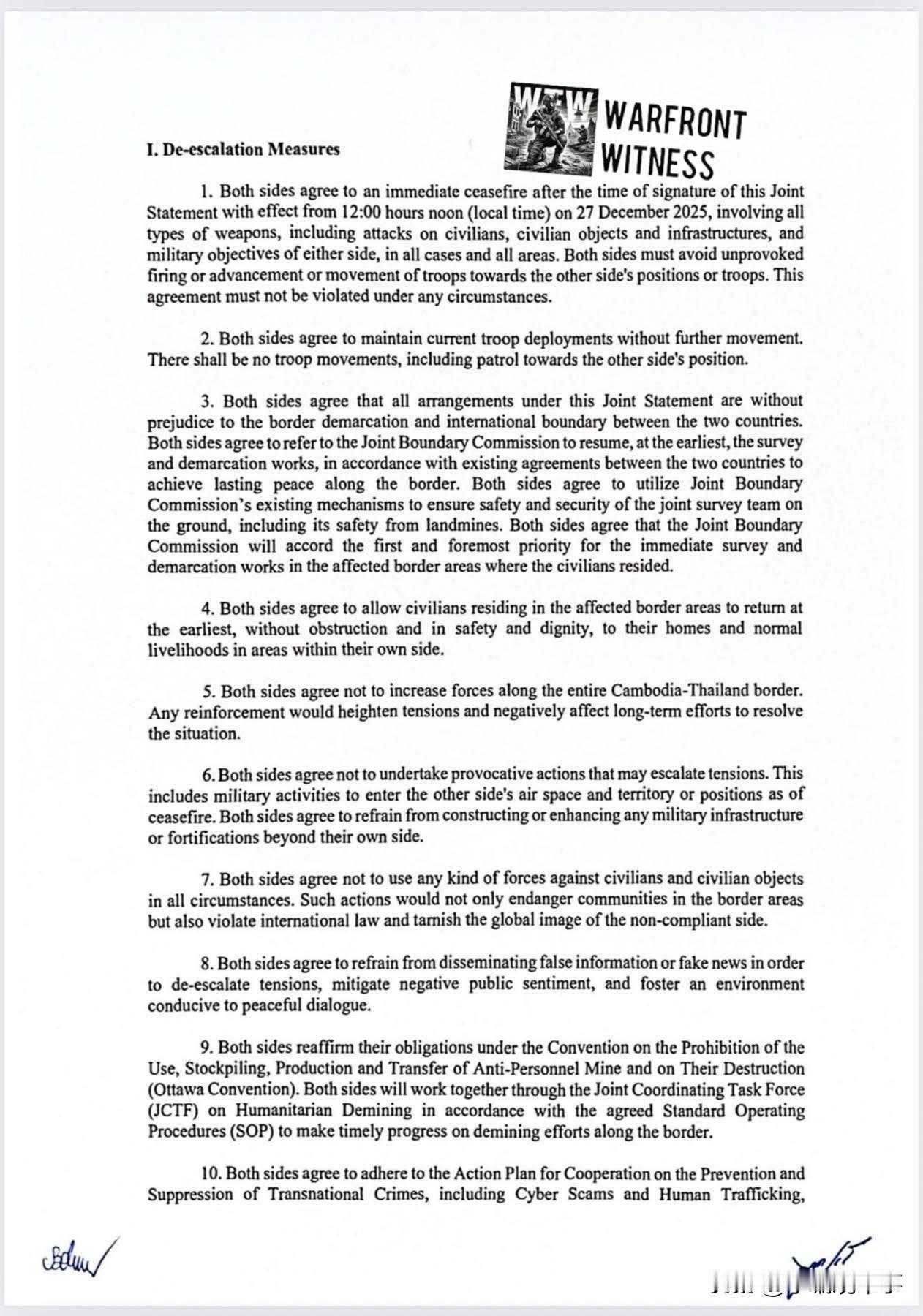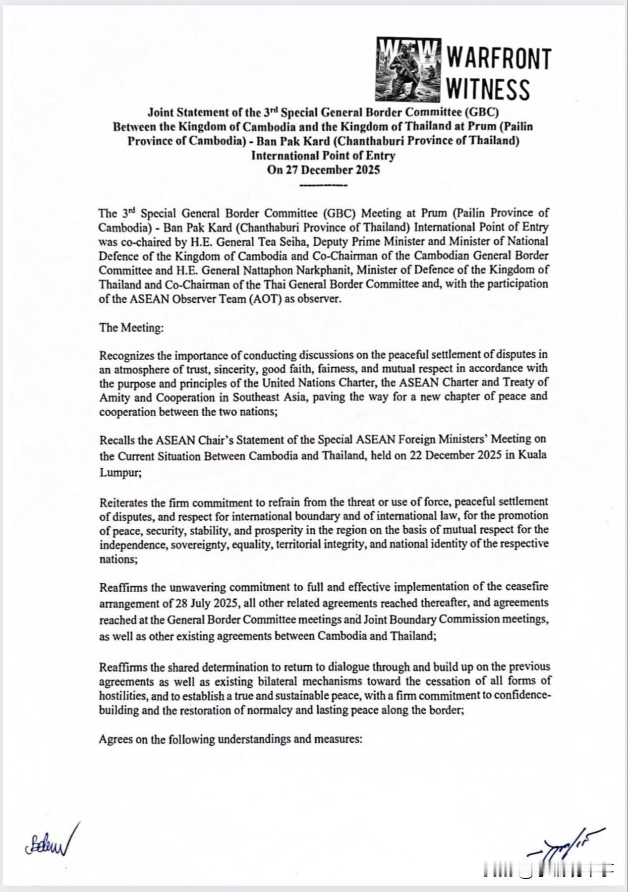 ⚡️柬埔寨和泰国在柬泰边界总委员会会议后发表联合声明,确认自当地时间12月27日中午12点起立即停火,重申停止敌对行动、冻结部队调动、允许平民返乡、恢复边境划界谈判,以及部署东盟观察员监督协议执行情况等承诺。
