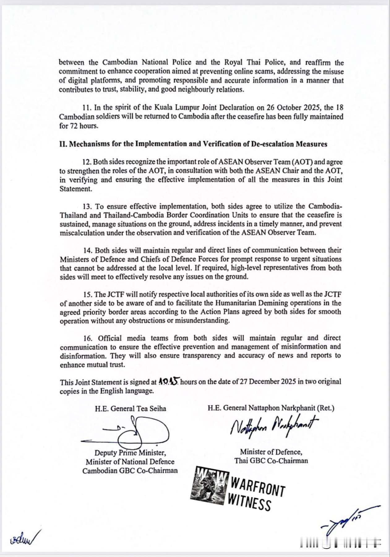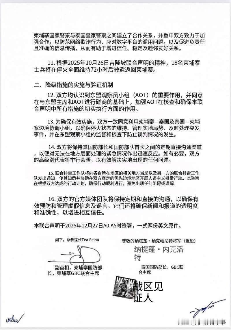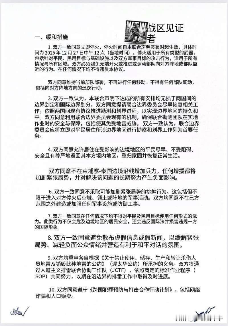 ⚡️柬埔寨和泰国在柬泰边界总委员会会议后发表联合声明,确认自当地时间12月27日中午12点起立即停火,重申停止敌对行动、冻结部队调动、允许平民返乡、恢复边境划界谈判,以及部署东盟观察员监督协议执行情况等承诺。