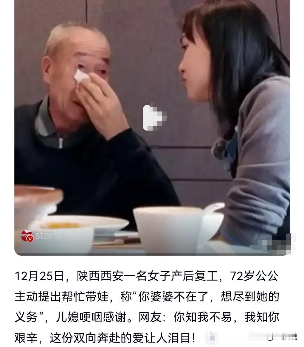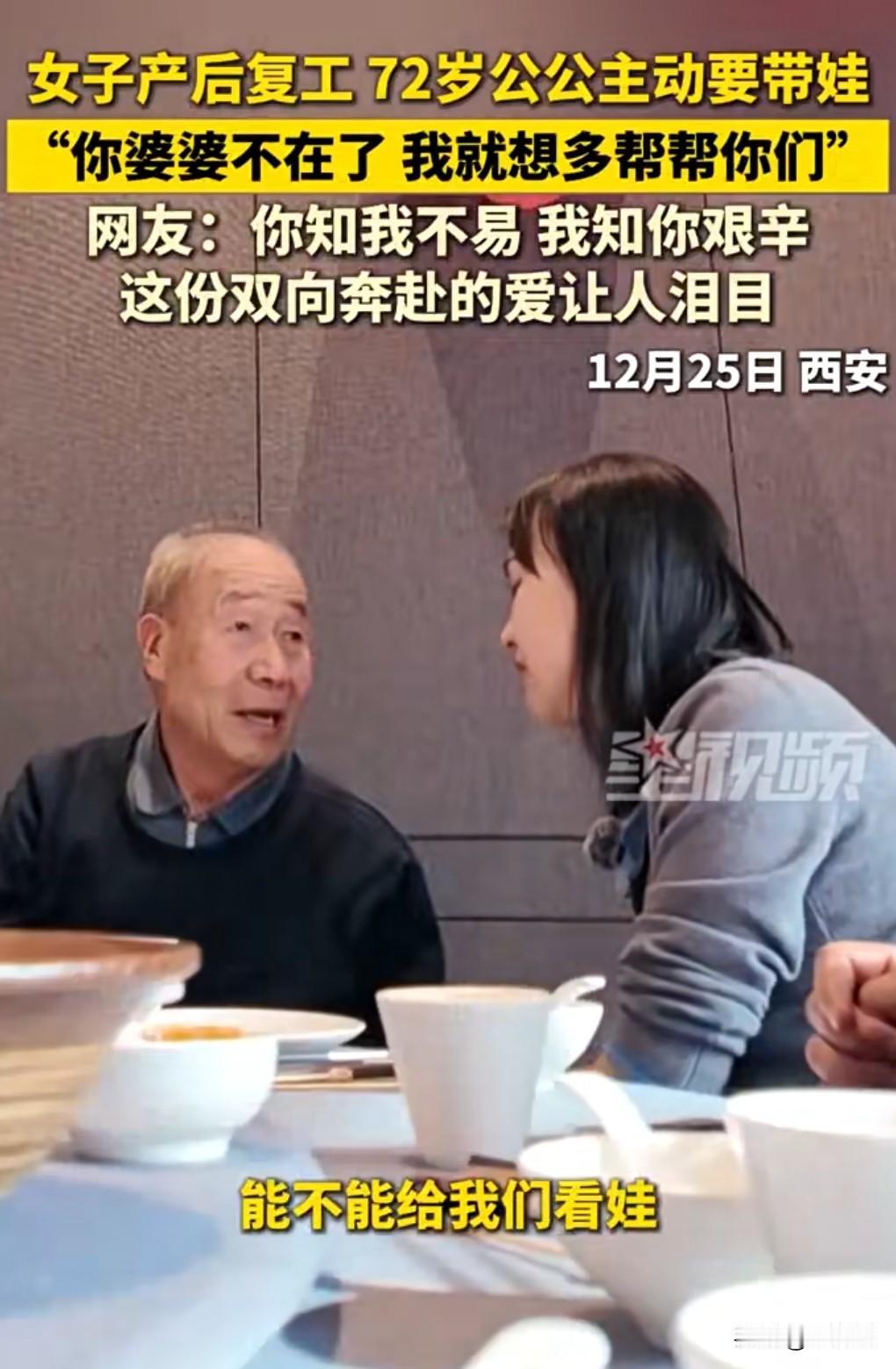 这公公真的是个好公公啊。 女子哽咽感谢72岁公公主动帮带娃。 72岁还主动提出帮带娃。 原来男子的老婆去世了,他想尽到做婆婆的义务。 女子也是非常的感谢,都感动的哭了。 公公也被说的感动的哭了。