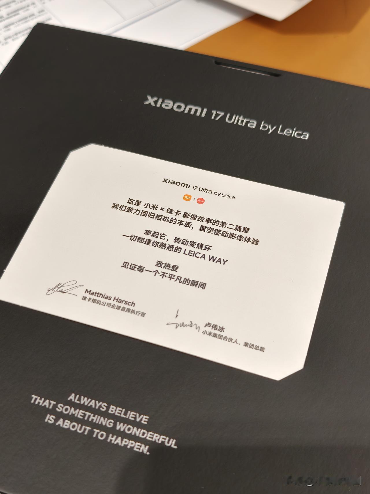 小米17 Ultra徕卡版上手,快速说说感受: 手感:首先相比于小米15 Ultra屏幕会更大更宽,再加上直屏,上手第一感觉是手机会稍微大一点点。不过17Ultra的握持手感是上升了,不是因为变薄1mm,而是因为镜头模组上移了一丢丢,也变小了一丢丢,比较不挡手指了。徕卡版边框的齿槽手感也很好。 外观:徕卡版的加分项必然是徕卡可乐标了,以及专属的主题,其他的我觉得差别不大。 影像:4摄变三摄,后置大圆环可以旋转,机械震感很解压,还没详细测试,初步觉得照片德味更浓了,更有胶片质感,很有拍照的欲望。 其他:徕卡版跟普通版贵了500,建议直接上徕卡版,非常超值!徕卡可乐标、解压的机械转盘、专属的设计,而且包装盒里面的配件也很超值,徕卡镜头盖(相机的售价就要几百块),专属手机壳、挂绳,对了,这个手机壳也是有徕卡可乐标的,并且镜头环也是能旋转的,不知道会不会有标准版想买这个壳?取手机遇到一个米粉,说问了厦门6家门店都说徕卡版没货了,卢伟冰会抓紧拧螺丝的吧?