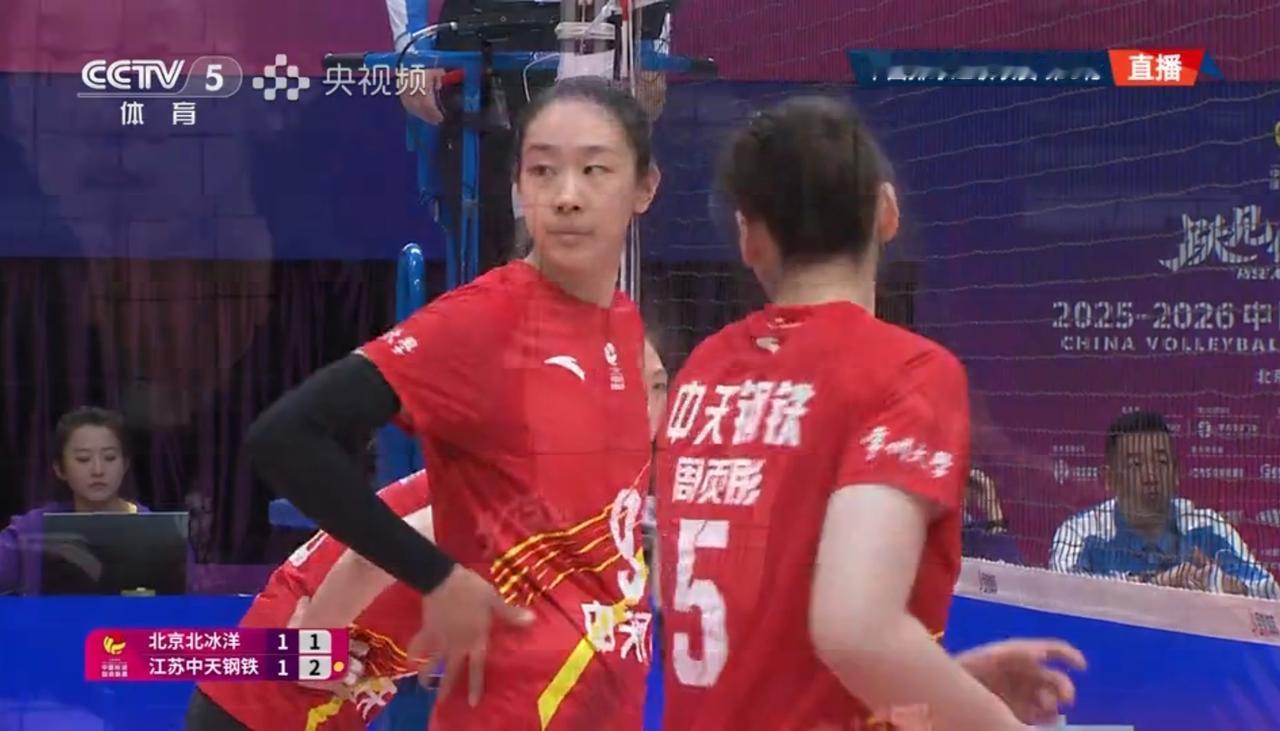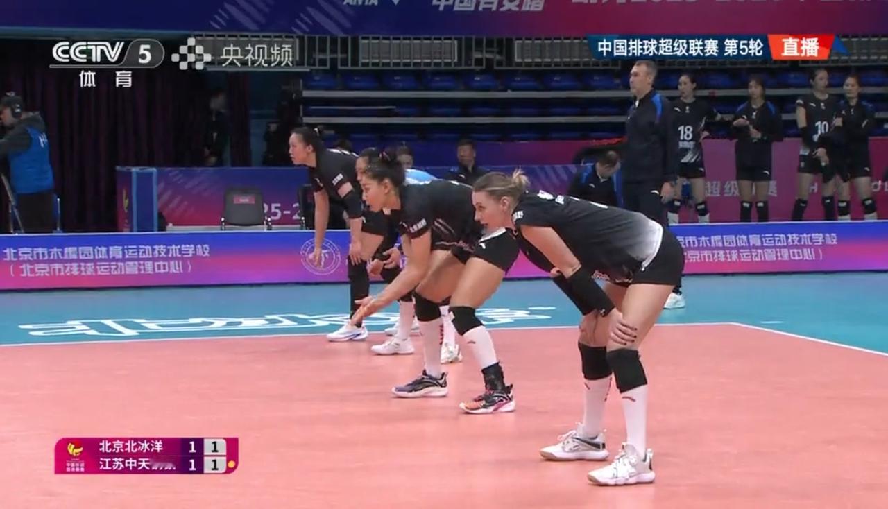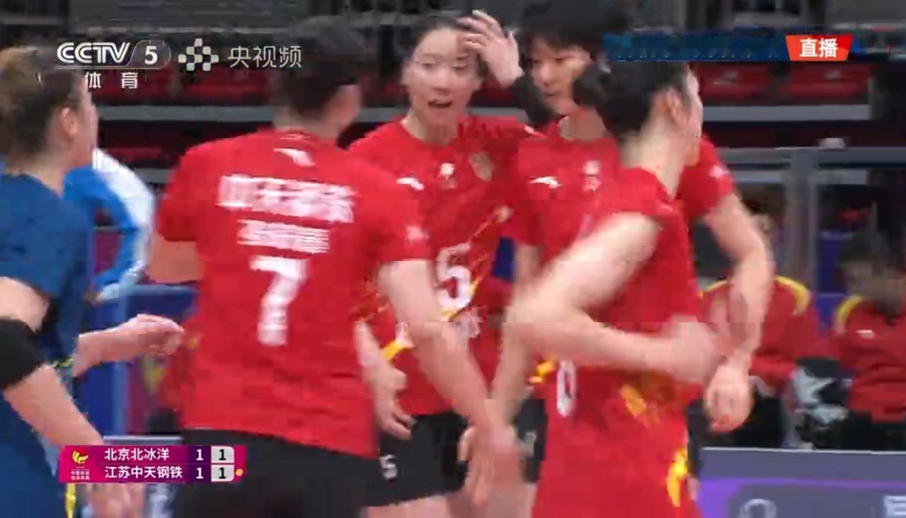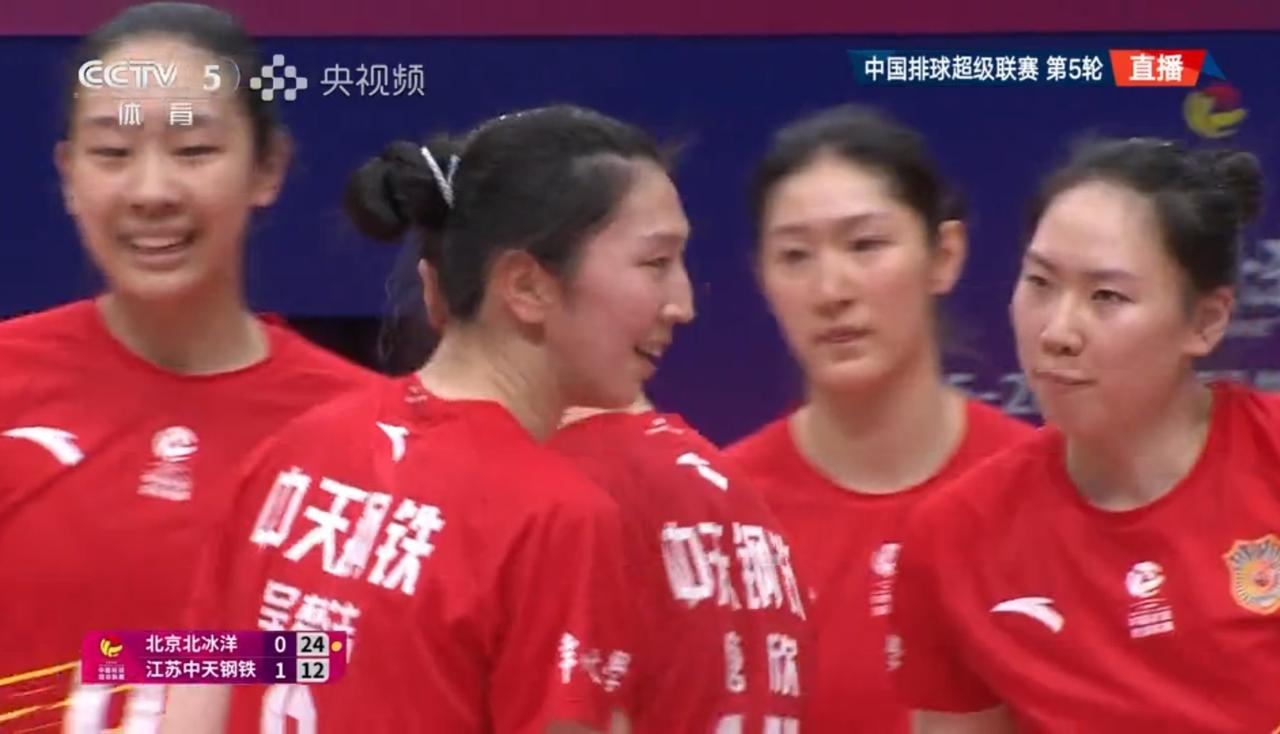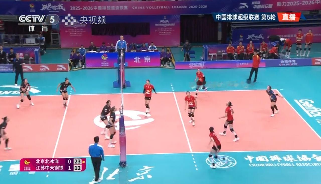 【女排超级联赛】常规赛第五轮:北京——江苏 实时战况: 12月27日晚15:00时,全国女排超级联赛第五轮北京——江苏的比赛在北京队的主场打响。目前江苏中天大比分1:0领先。第二局开始,北京5:0领先。5:2,吴梦洁打手出界。6:2,单琳倩。6:3,吴梦洁。6:4,唐欣打探头。7:4金烨。7:5,吴梦洁。8:5,9:5,10:5唐欣被拦。江苏暂停11:5。12:5, 12:6, 13:6,13:7,郭中楠快攻。14:7,15:7,15:8,15:9,周页彤。16:9,17:9,18:9,19:9,吴梦洁扣球出界。20:9,20:10, 20:11,北京吊球出界。20:12,北京暂停。23:12,24:12,24:13,24:14,25:14,北京胜第二局,大比分双方1:1平! 第三局比赛正在进行中……