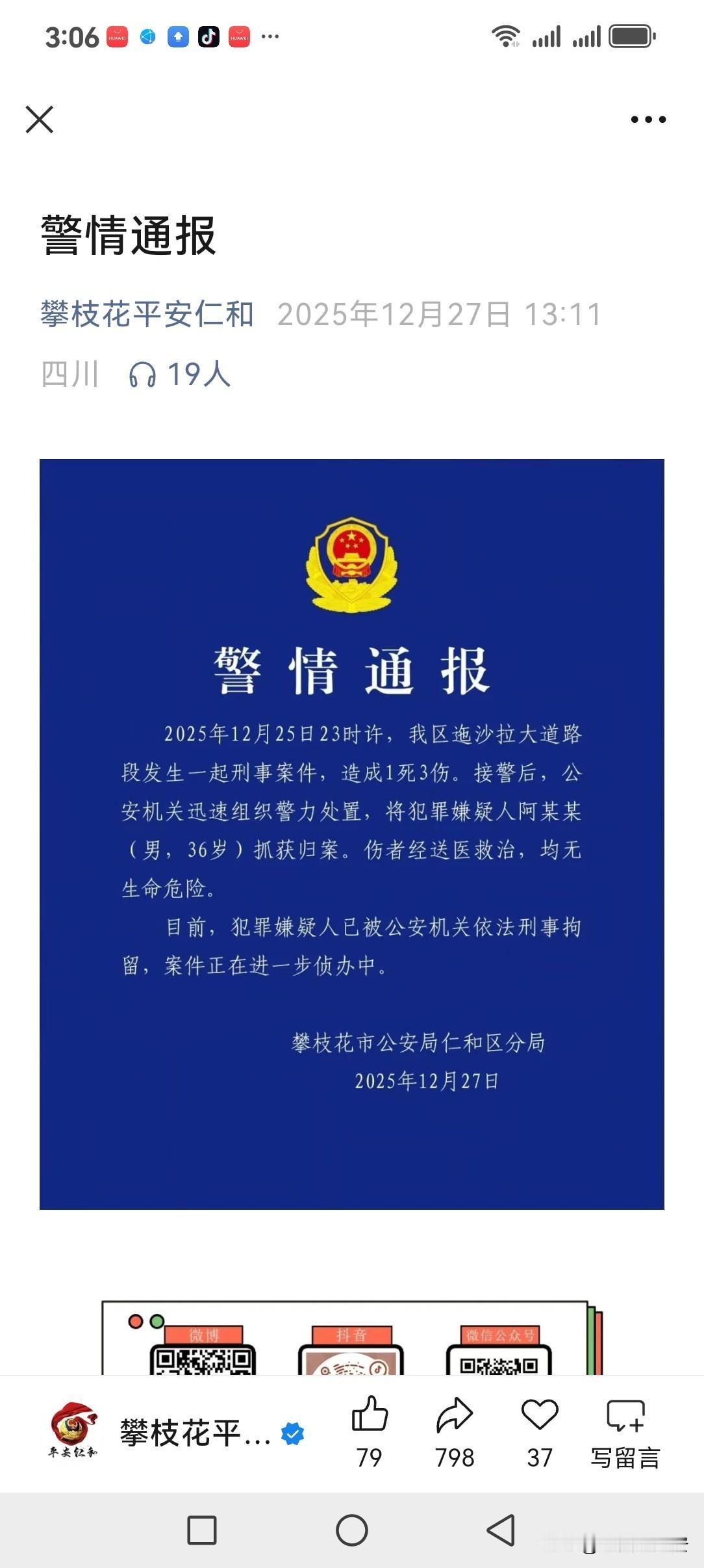 快讯 今天(2025年12月27日),攀枝花平安仁和微信公众号权威发布了关于四川省攀枝花市公安局仁和区分局于今天权威发布的关于就2025年12月25日23时许,在四川省攀枝花市仁和区迤沙拉大道路段发生一起致使造成1死3伤的刑事案件。 以及,接警后,公安机关迅速组织警力处置,将犯罪嫌疑人阿某某(男,36岁)抓获归案与伤者经送医救治,均无生命危险和目前犯罪嫌疑人已被公安机关依法刑事拘留,案件正在进一步侦办中的警情通报的消息。 信息来源:攀枝花平安仁和微信公众号 大美四川