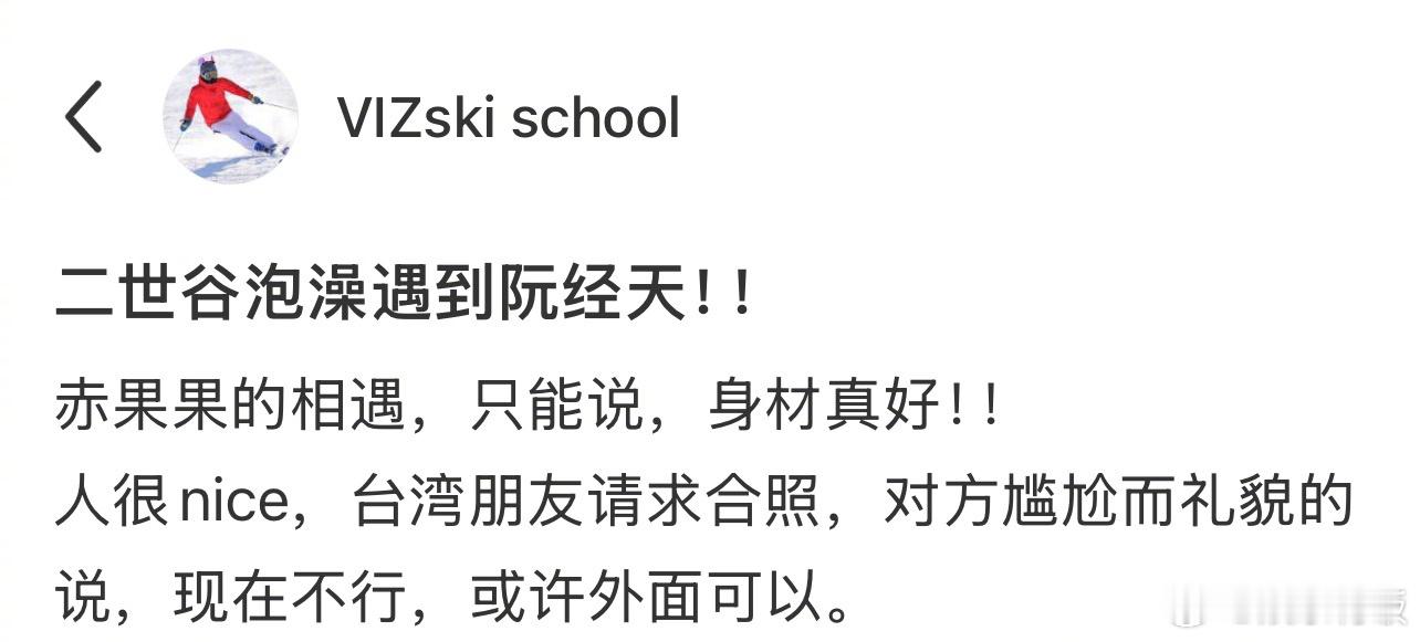 阮经天泡澡时被要合影偶遇阮经天泡澡 这么小众的事情也是被我们网友偶遇到了有网友在日本二世谷泡澡时偶遇阮经天,两个人就这么赤果果的相遇了,还夸阮经天身材非常好有台湾的朋友想要和阮经天合照,但是阮经天太尴尬了,说现在不行,也许到外面可以