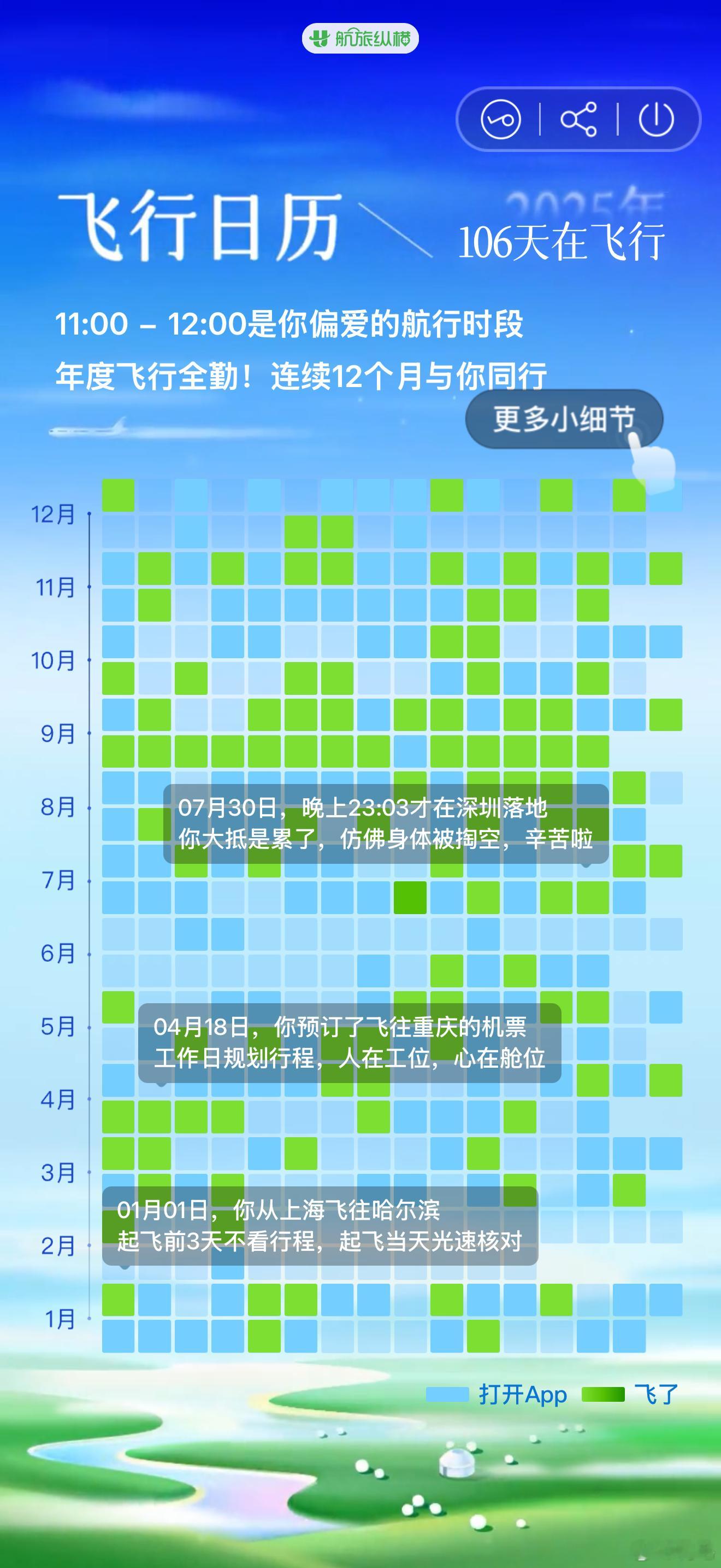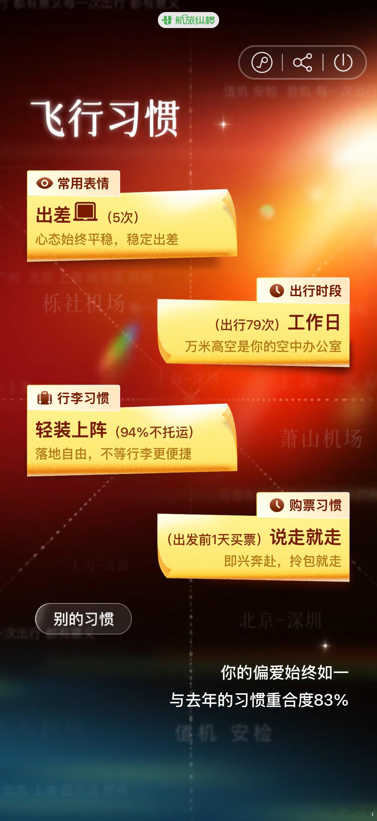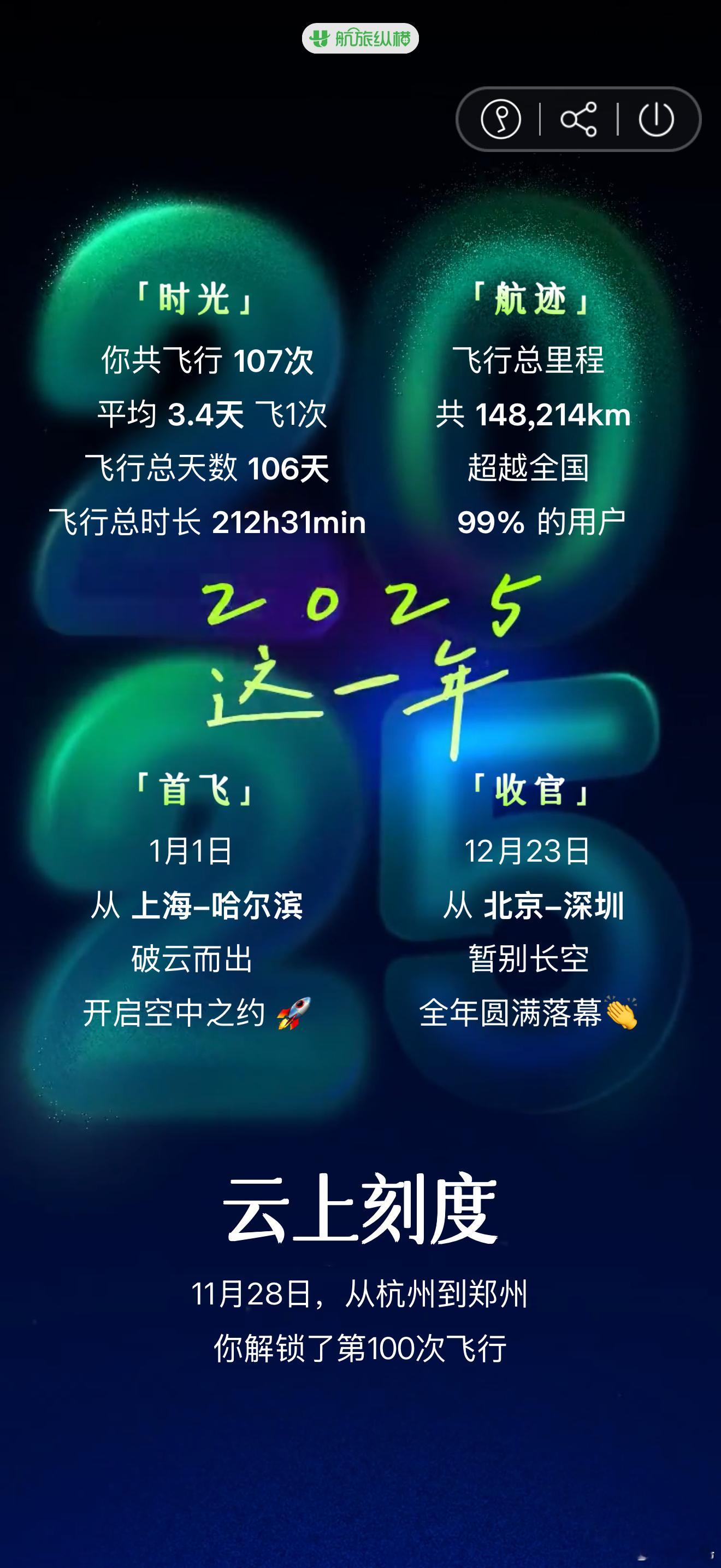 今年飞了212小时31分钟,148214公里,其实28号还有一趟没飞。说实话,一趟飞机飞3个小时的经济舱实在是太累了,明年考虑3个小时以上的飞机尽量升舱。今年东航把白金卡达标金额提到了10万级,今年还是没飞出来,差1万出头一点吧,明年努努力,问题应该不大。最搞笑的是航旅纵横给我颁发了一个「卡点主理人」的称号,最短候机时间3分钟,今年极限登机的次数还是太多了……