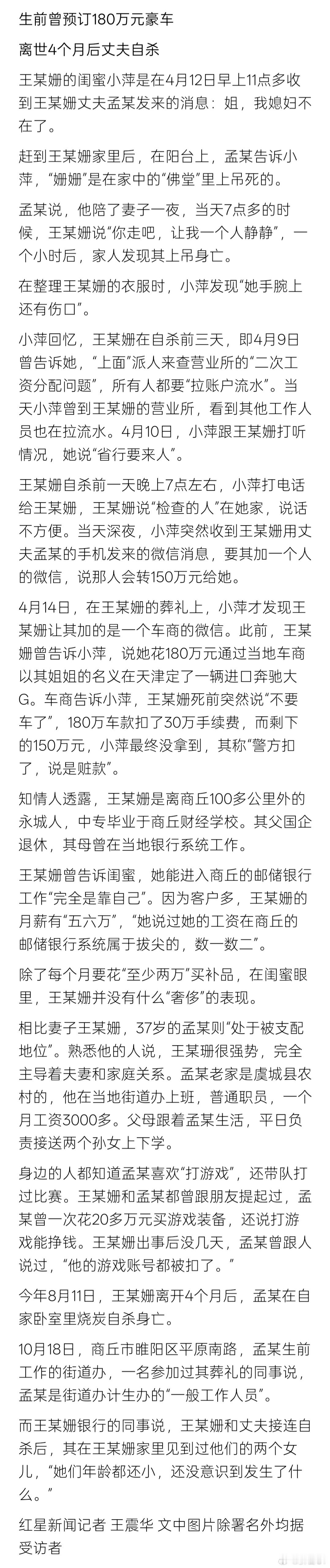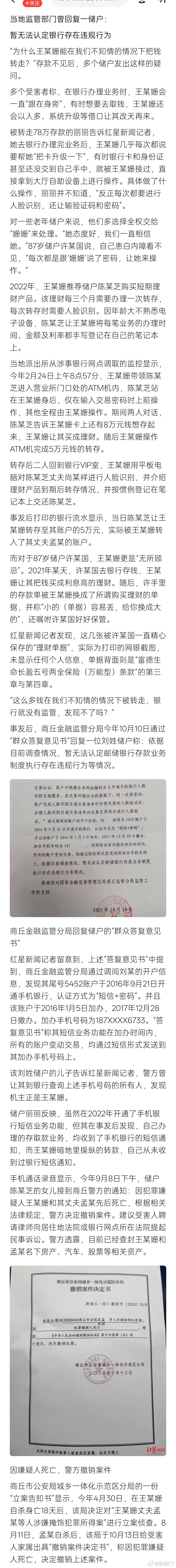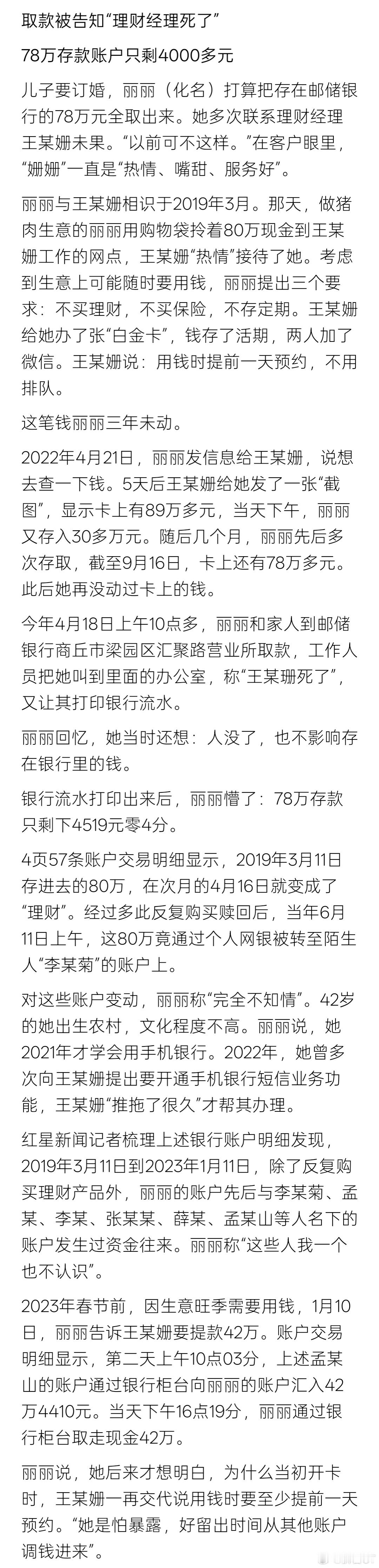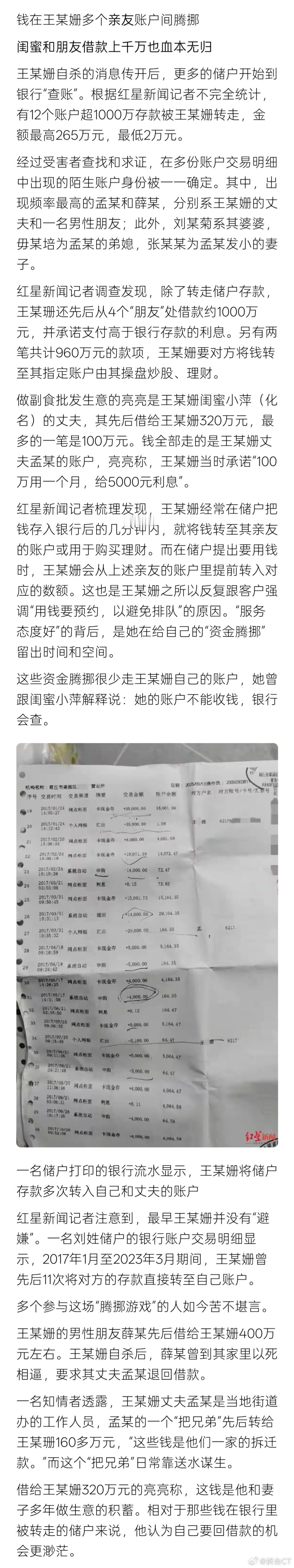36岁银行女经理和丈夫先后自杀这个女的,真的是坏到骨子里了。储户出于信任,在她这里存了钱,有些还叮嘱她,不买理财,不买保险,不存定期。结果她在储户存钱后不久,就把钱转走。据不完全统计,有12个账户,超1000万存款,被其转走,金额最高265万元,最低2万元。更恶心的是,她还特意叮嘱储户,“用钱时提前一天预约,不用排队”。看起来很是贴心,实际上是留出时间从其他账户调钱进来,毕竟,储户把钱存进来,总有急用钱的时候。综合报道来看,她这么干已有将近10年,后续会败露系“上面”派人来查营业所的“二次工资分配问题”,所有人都要“拉账户流水”。今年4月12日,王某珊自缢身亡,4个月后,也就是8月11日,王某珊丈夫亦烧炭自杀身亡。人死了,但问题还在。不过,储户们的钱能否全部追回,目前来看仍有待观察。银行女经理和丈夫自杀储户钱被转走