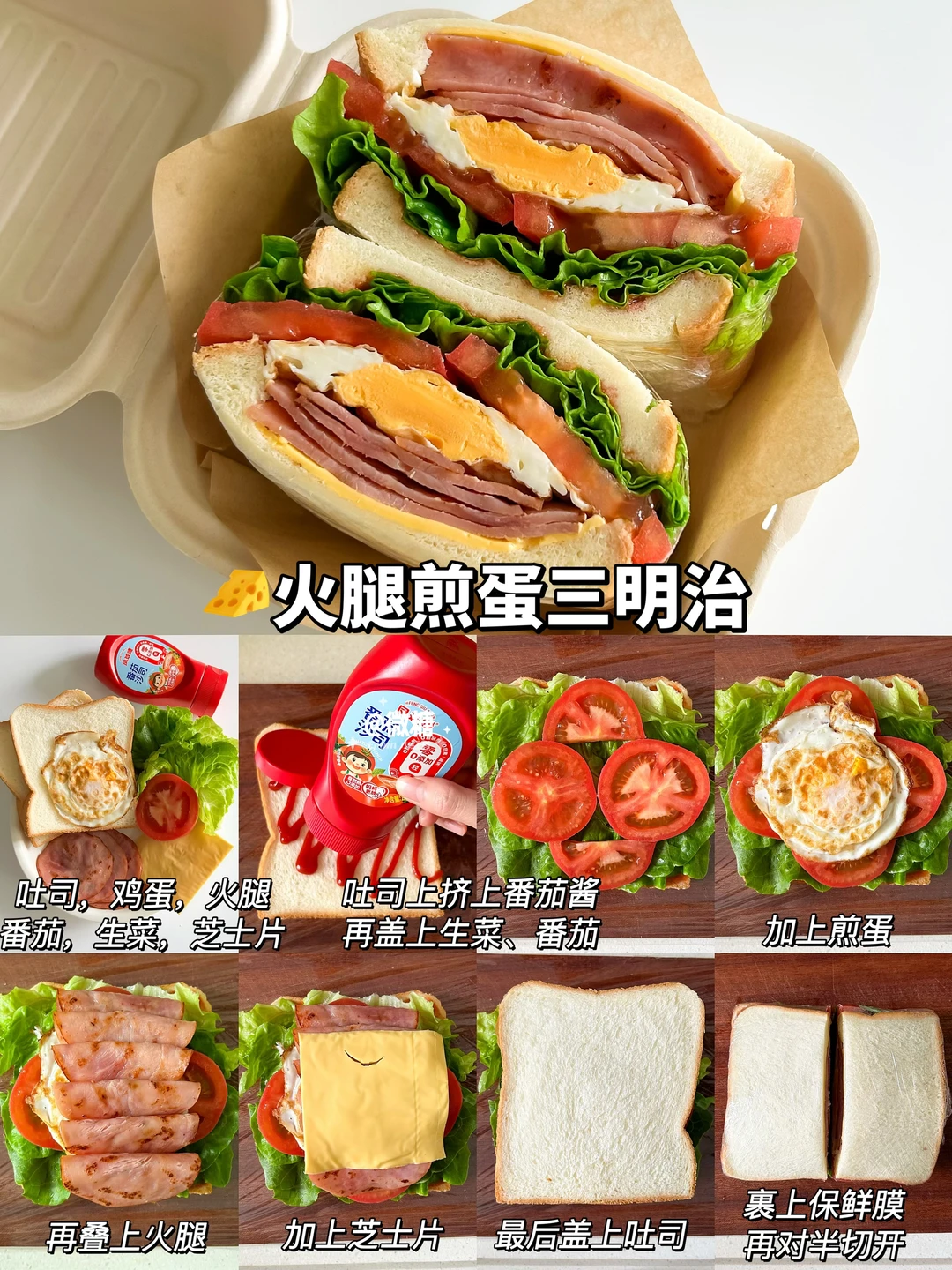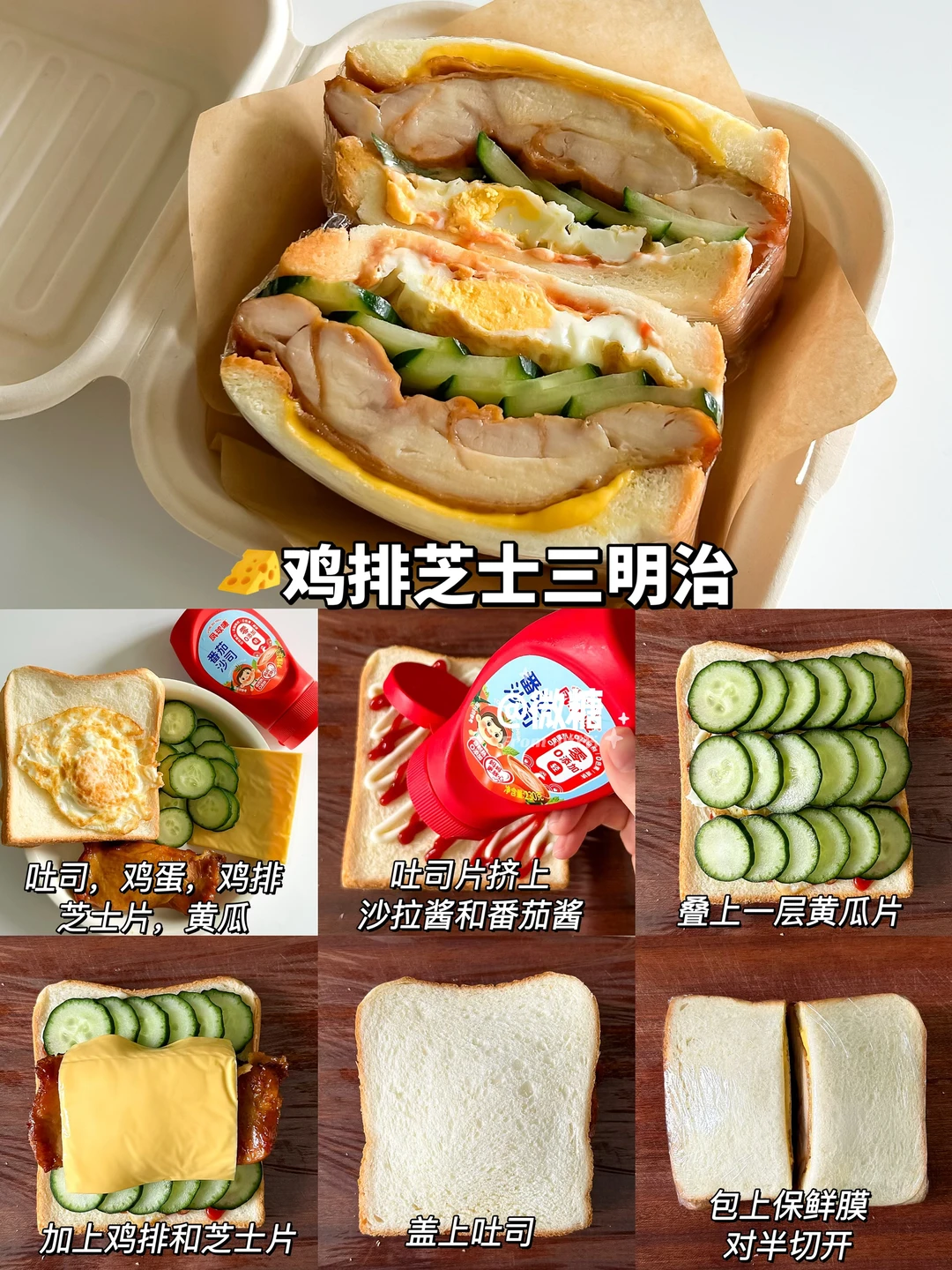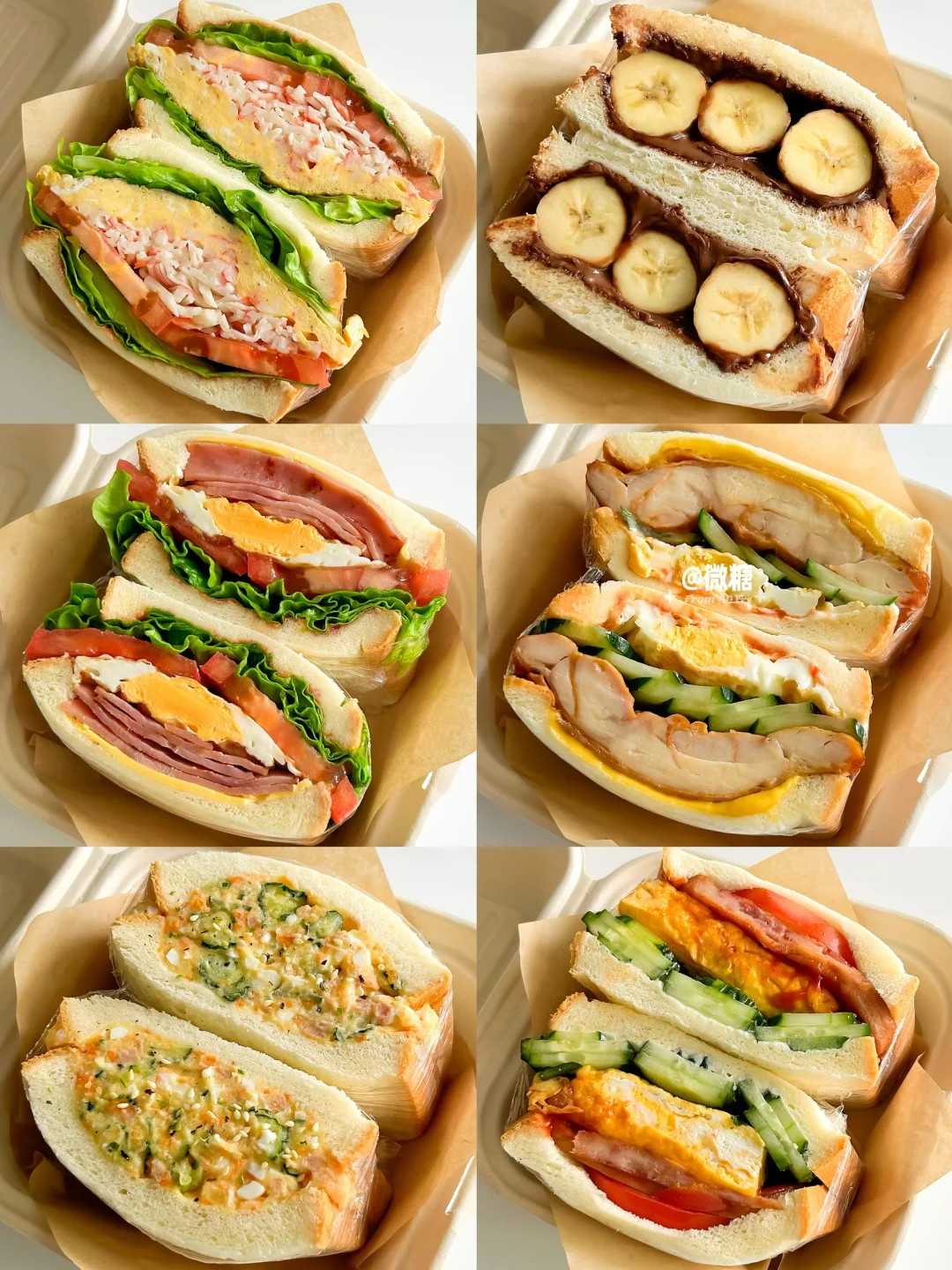 早餐最喜欢吃三明治啦!这样搭配的三明治真的巨好吃😋营养又快手,每天吃都吃不腻💕让孩子爱上吃早餐~一份营养美味的三明治搭配上一杯牛奶,又是元气满满的一天😋 做法简单易做!10分钟轻松搞定~只需要将食材一层层叠起来,再包上保鲜膜切开即可👌🏻 🦀蟹柳滑蛋三明治 🍌香蕉巧克力三明治 🥪火腿煎蛋三明治 🧀鸡排芝士三明治 🥔土豆沙拉三明治 🥒黄瓜厚蛋三明治