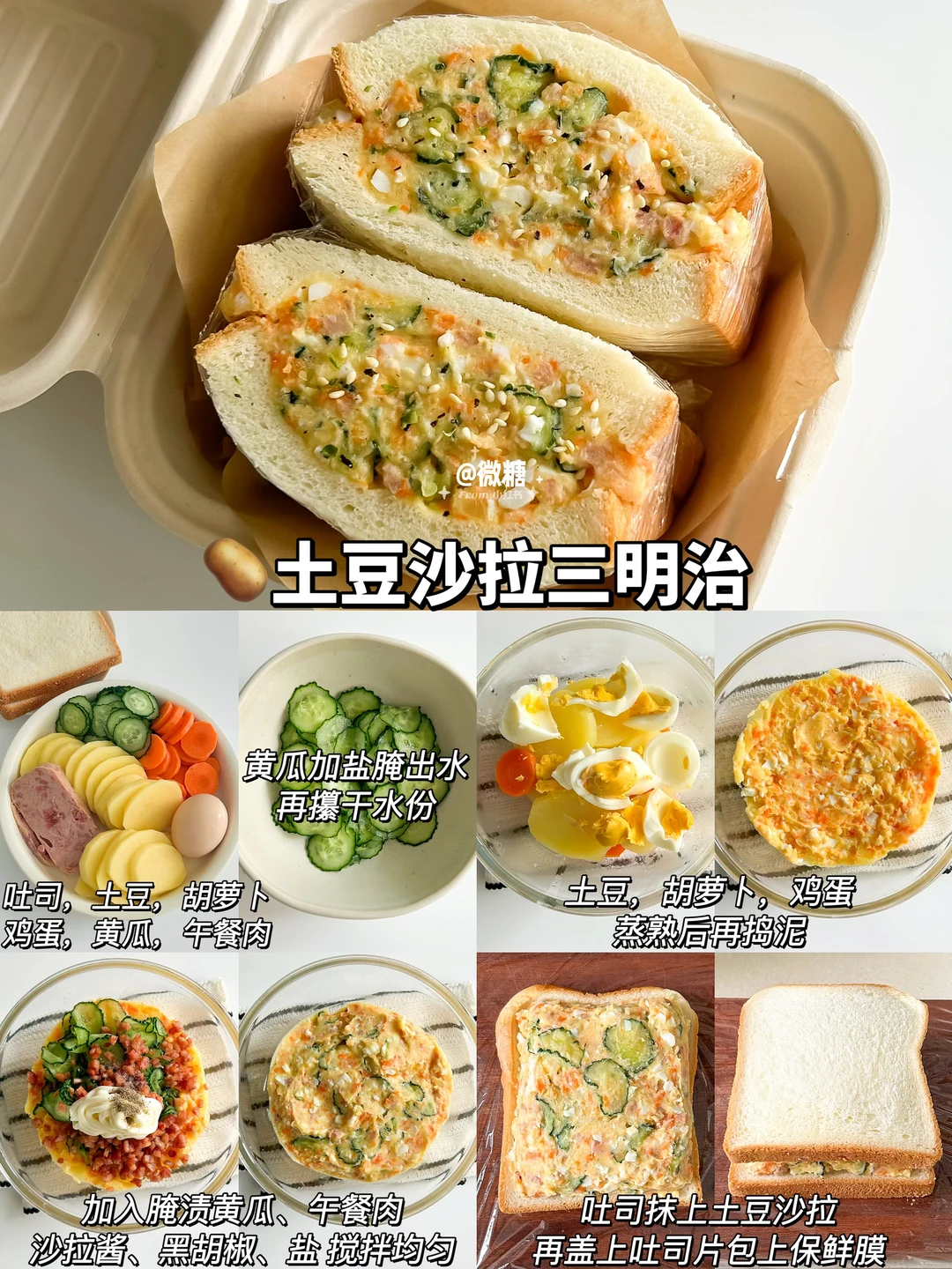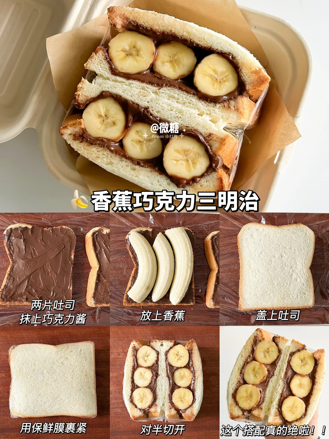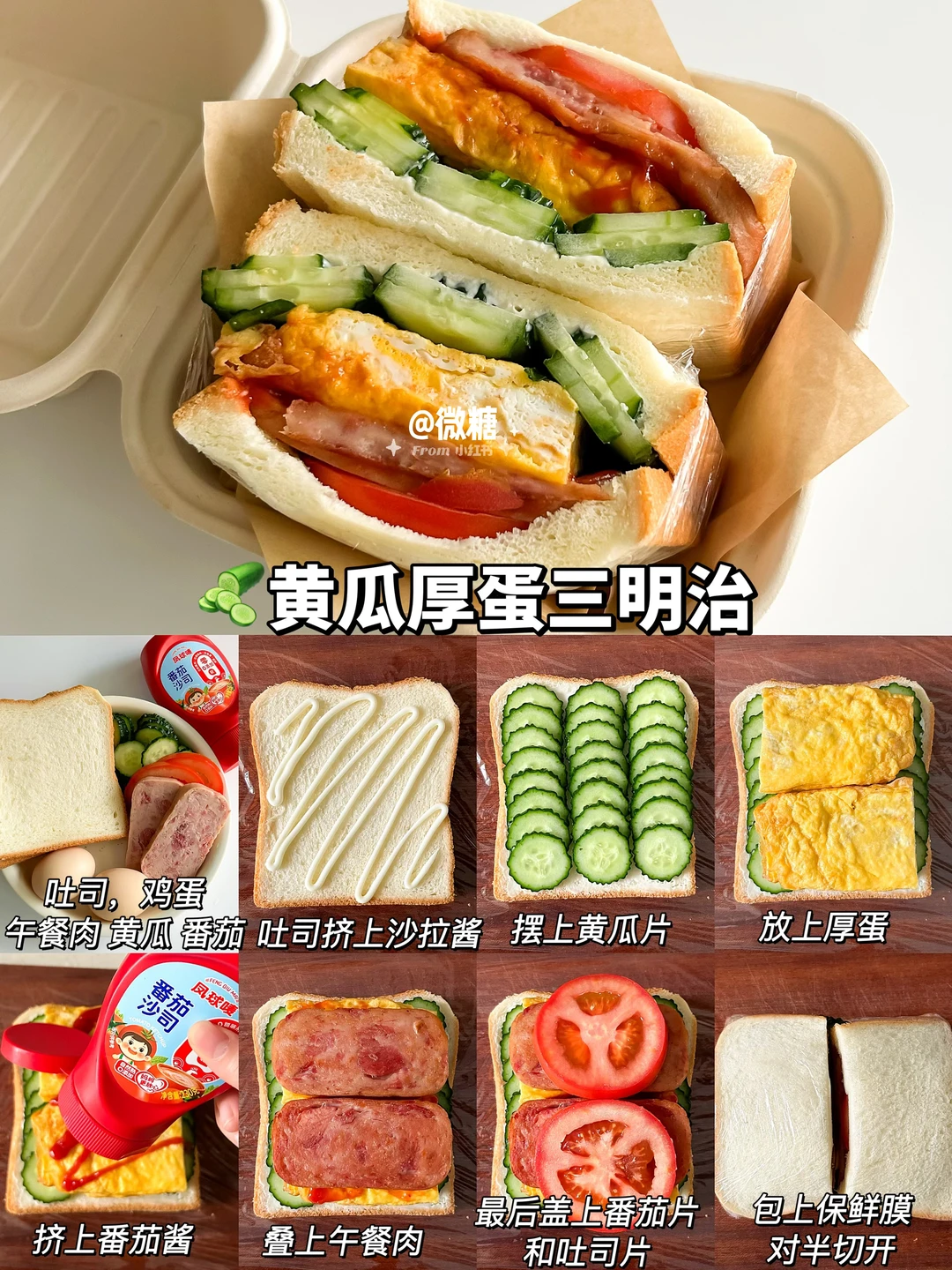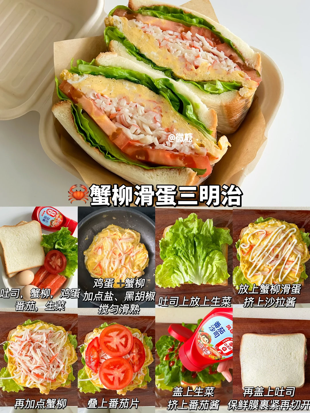 早餐最喜欢吃三明治啦!这样搭配的三明治真的巨好吃😋营养又快手,每天吃都吃不腻💕让孩子爱上吃早餐~一份营养美味的三明治搭配上一杯牛奶,又是元气满满的一天😋 做法简单易做!10分钟轻松搞定~只需要将食材一层层叠起来,再包上保鲜膜切开即可👌🏻 🦀蟹柳滑蛋三明治 🍌香蕉巧克力三明治 🥪火腿煎蛋三明治 🧀鸡排芝士三明治 🥔土豆沙拉三明治 🥒黄瓜厚蛋三明治