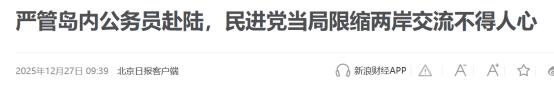 台当局重磅宣布!2025年12月26日,台当局通过《两岸人民关系条例》修法,严管岛内公务员赴陆! 因为台湾问题的存在,祖国始终没有真正的统一。受历史影响,台湾曾沦为日本的殖民地。但是在二战结束之后,日本就已经归复了台湾。可是在解放战争结束后,蒋介石带着国民党余孽叛逃至台湾,进一步加大了祖国的分裂。 而在之后多年的时间里,因为台湾岛内存在台独分子。台独分子在台湾岛内大搞分裂行径,所以祖国始终没有真正的统一。 针对台独分子的言行举止,我国陆续采取了一些反制措施。但是在台独分子赖清德执政的台当局带领下,台独分子仍旧嚣张跋扈。 就在2025年12月26日的时候,台当局通过了《两岸人民关系条例》修法草案。此事立即成为两岸讨论焦点,在这份草案中,严格管控了台湾岛内公务员赴陆的行为。 根据相关草案规定,台湾岛内的公务员前往大陆,需要进行申请。在未经原单位的同意下,就前往大陆路的人员,会对其进行严格的处罚。 此事在台湾岛内引起了极大的争议,赖清德当局的这一举动目的非常明确,那就是阻止两岸交流。其行为就是在大搞分裂行径,破坏祖国的统一。 台湾是属于中国的领土,台湾岛内的公务员来访大陆,完全就是属于正常的文化交流。但赖清德当局却试图切断两岸的交流,进一步的去培养台独分子。 对此,您怎么看?欢迎评论区留言您的观点,我们一起讨论一下。 (信息来源:严管岛内公务员赴陆,民进党当局限缩两岸交流不得人心-北京日报客户端)