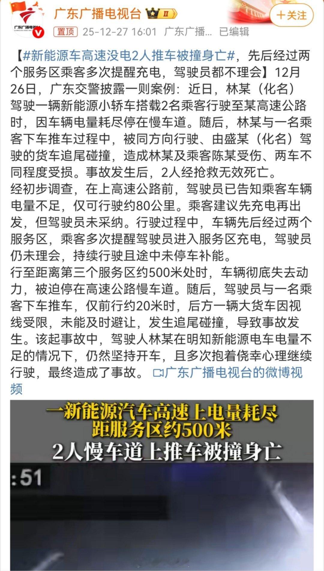 新能源车高速没电2人推车被撞身亡在上高速公路前,驾驶员已告知乘客车辆电量不足,仅可行驶约80公里。此时乘客建议先充电再出发,但驾驶员未采纳,另外车辆先后经过两个服务区,乘客也多次提醒驾驶员进入服务区充电,驾驶员仍未理会。距第三个服务区500米处时,车辆没电被迫在高速慢车道推车。最终被大货车因视线受限,躲避不及追尾碰撞。遇上这样的驾驶员,真的醉了,抱着侥幸心理,最终害己害人。 呼伦贝尔
