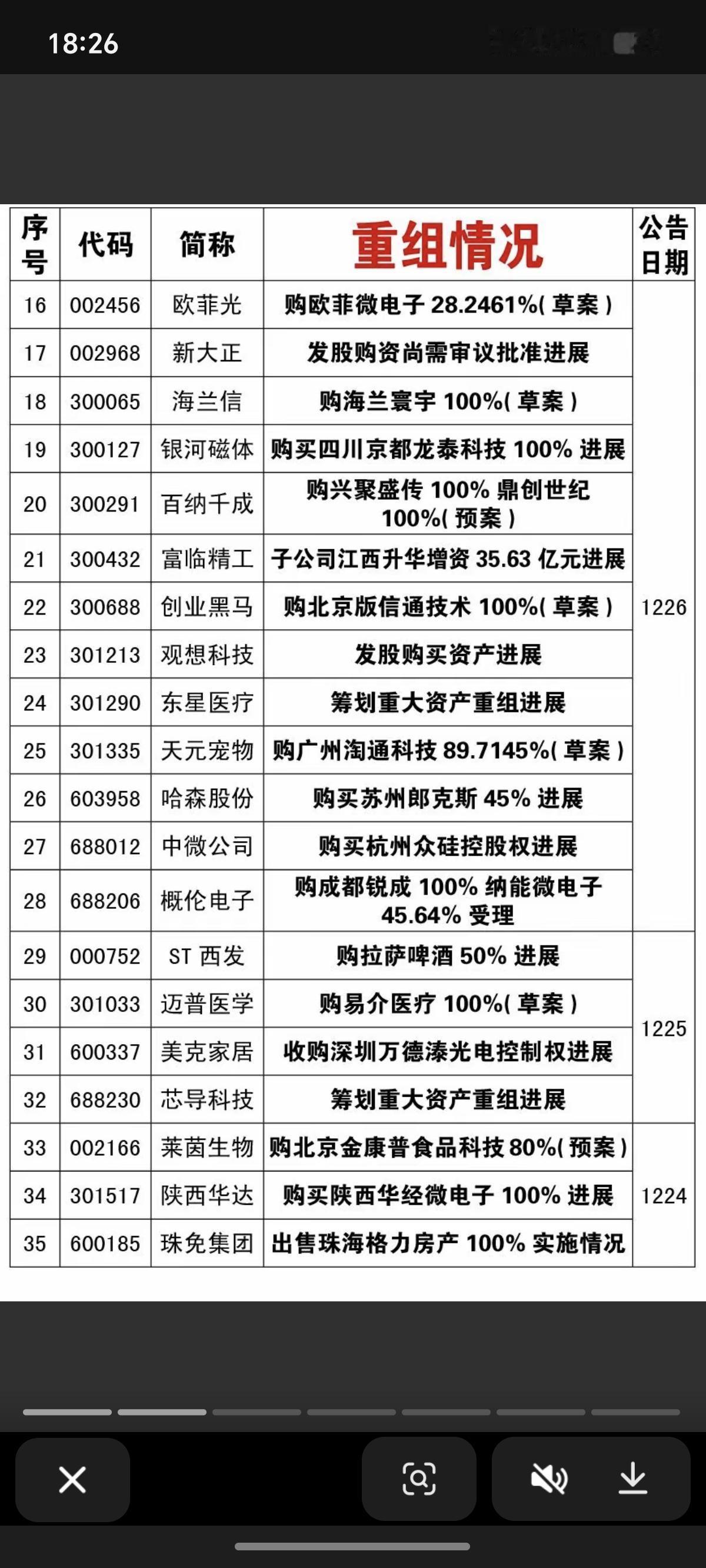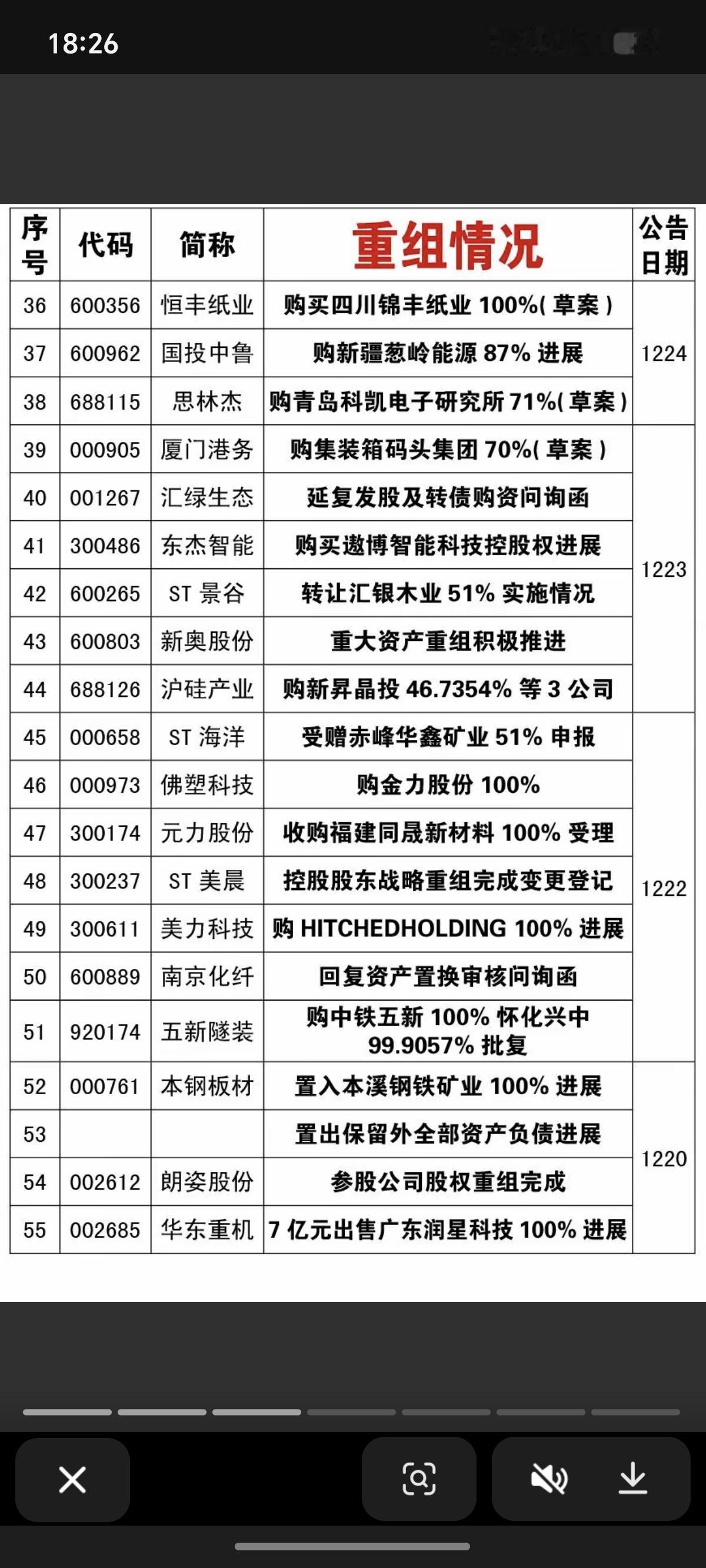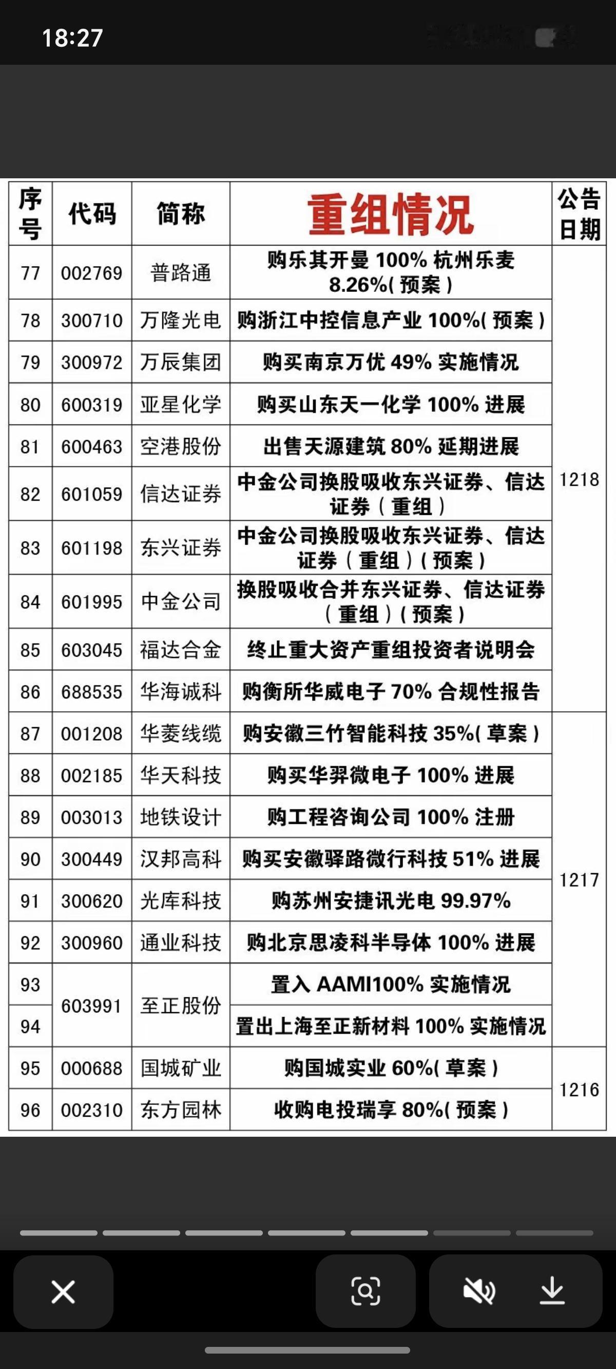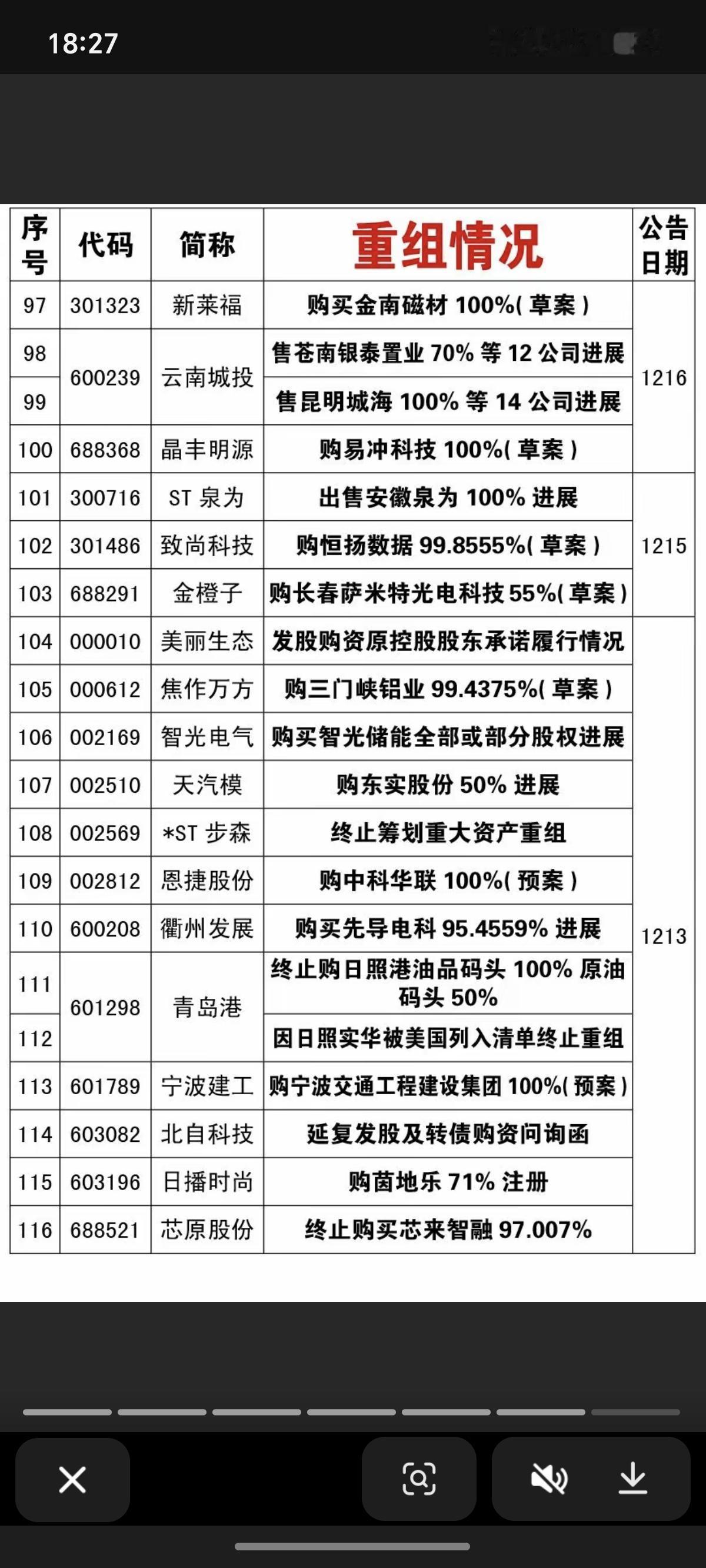 半月报:120家公司披露资产重组事项! 12.12~12.27期间,累计有120家公司披露资产重组事项。 资产重组,做大做强!也是高层推崇备至的战略规划!