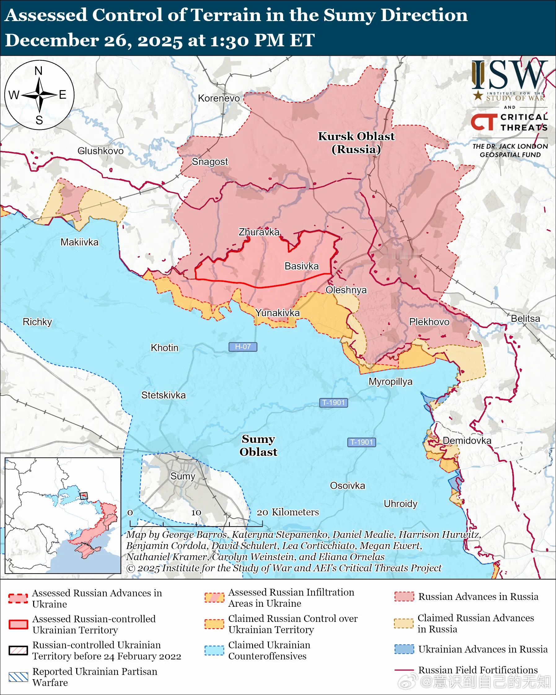北方轴心俄罗斯的目标:在乌克兰北部沿国际边界建立可防御的缓冲区。12月25日和26日,俄军继续在苏梅州北部发动进攻,但没有取得确切进展。未经证实的说法:俄罗斯军事博客作者声称,俄军向奥列克西夫卡(苏梅市北部)以东和以南推进,并沿着苏梅市至苏贾的 H-07 公路向尤纳基夫卡(苏梅市东北部)以南推进。俄军攻击了库尔斯克州和苏梅州,包括奥列克西夫卡、金德拉季夫卡和安德里夫卡附近的苏梅市北部以及马拉科尔恰基夫卡方向;苏梅市东北部,靠近尤纳基夫卡;在苏梅市东南部靠近Hrabovske的地方。作战序列:据报道车臣艾哈迈德特种部队彼得斯克营和卡什坦支队的无人机操作员以及第15坦克团(第69摩步师,第6合成集团军,列宁格勒军区)正在米罗皮利亚(苏梅市东北部)附近打击乌克兰阵地。第106空降师的炮兵和无人机部队继续打击苏梅州的乌克兰阵地。