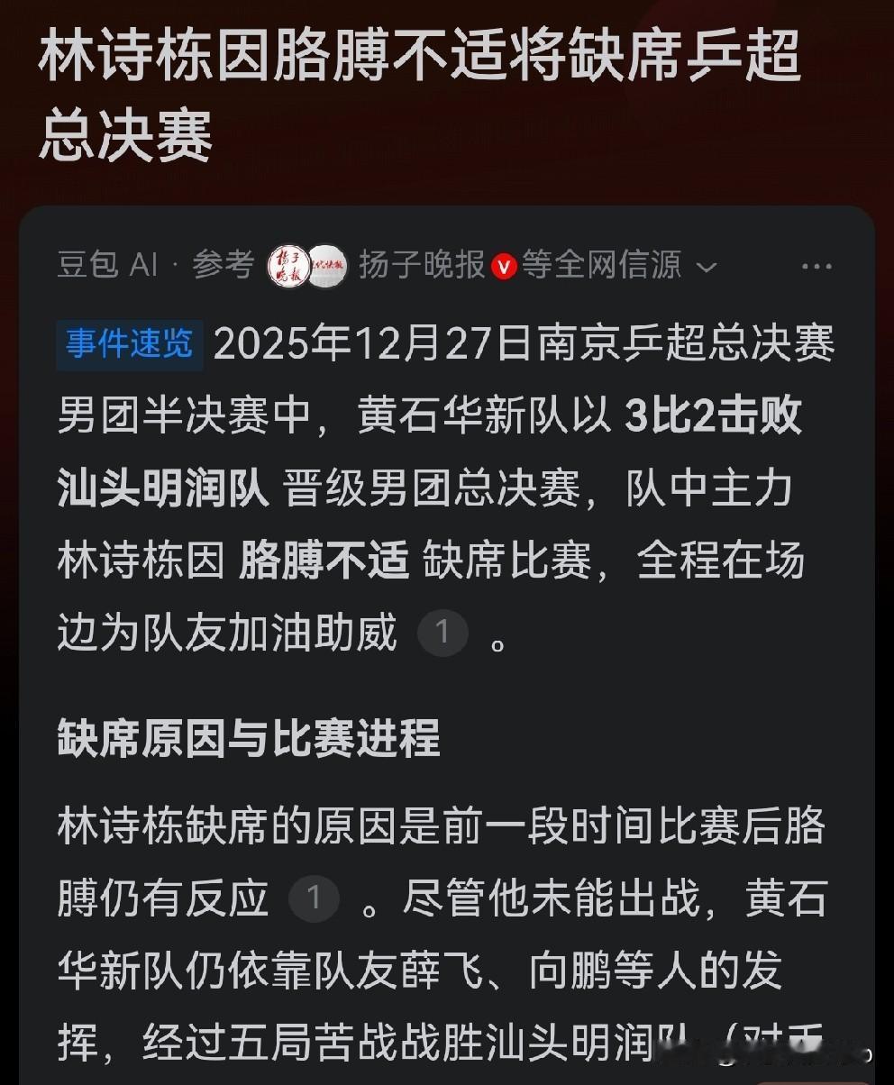 一个乒超总决赛,现役五大顶尖高手三个缺席,创乒超历史之最。 今年的中国乒乓,说不完的曲折,道不完的挫败,更是讲不完的故事。正在进行的乒超总决赛,先是樊振东因参加波尔圣诞节聚餐、备战德国杯比赛而放弃回国参加乒超总决赛;继而是孙颖莎因伤退出乒超总决赛;马上林诗栋又因胳膊不适转做比赛“壁上观”。只有王楚钦和王曼玉仍然坚持在比赛场上。这是乒超总决赛有史以来没有过的。 首先,不要过分解读。其次,个中滋味当事队员各有感触。对这个现象,球迷也是见仁见智。 对队员特别是主力队员的保护,合理安排赛程、处理好国内比赛和外国俱乐部比赛的关系,这些都是王励勤主席应该考虑的。