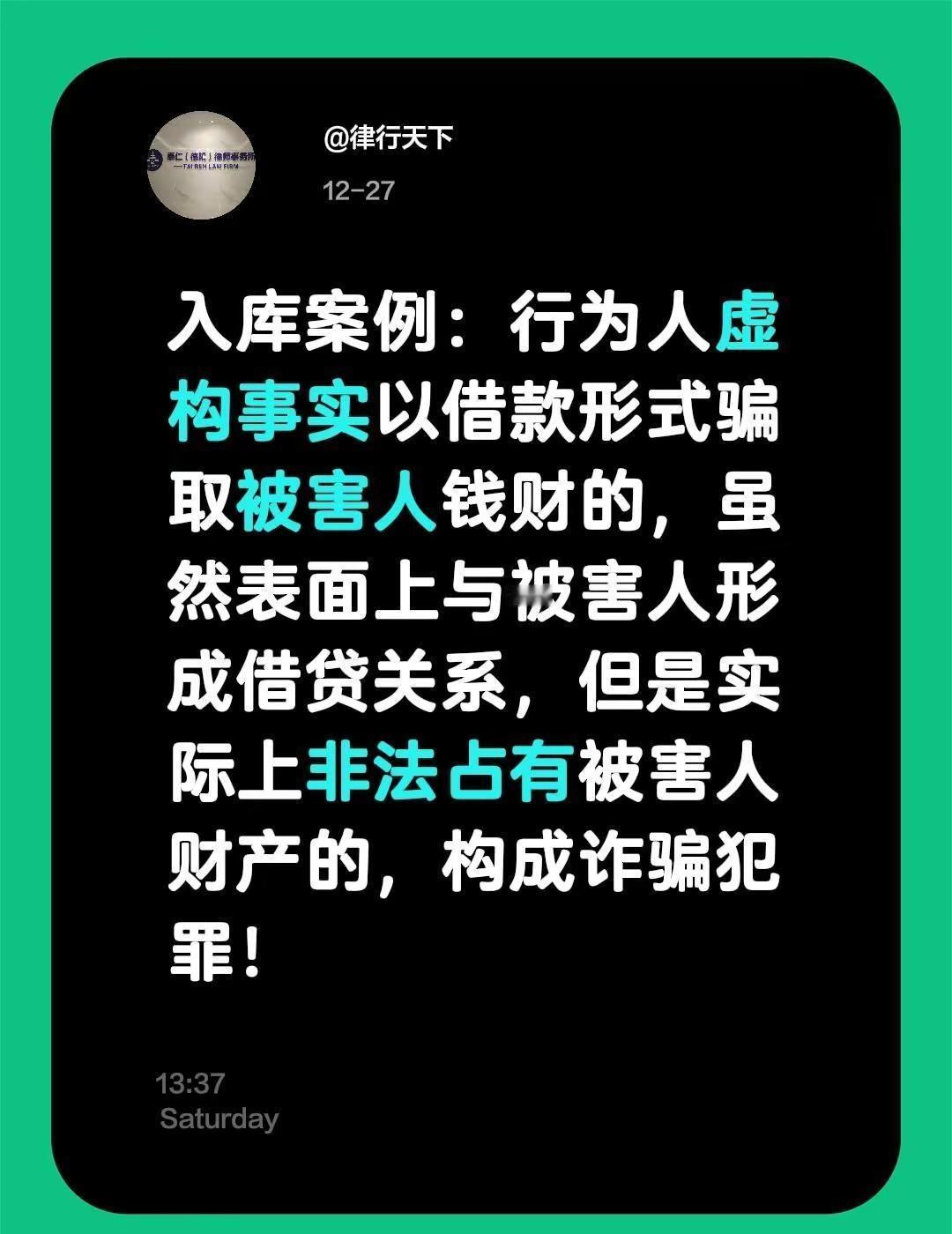 入库案例:行为人虚构事实以借款形式骗取被害人钱财的,虽然表面上与被害人形成借贷关系,但是实际上非法占有被害人财产的,构成诈骗犯罪!