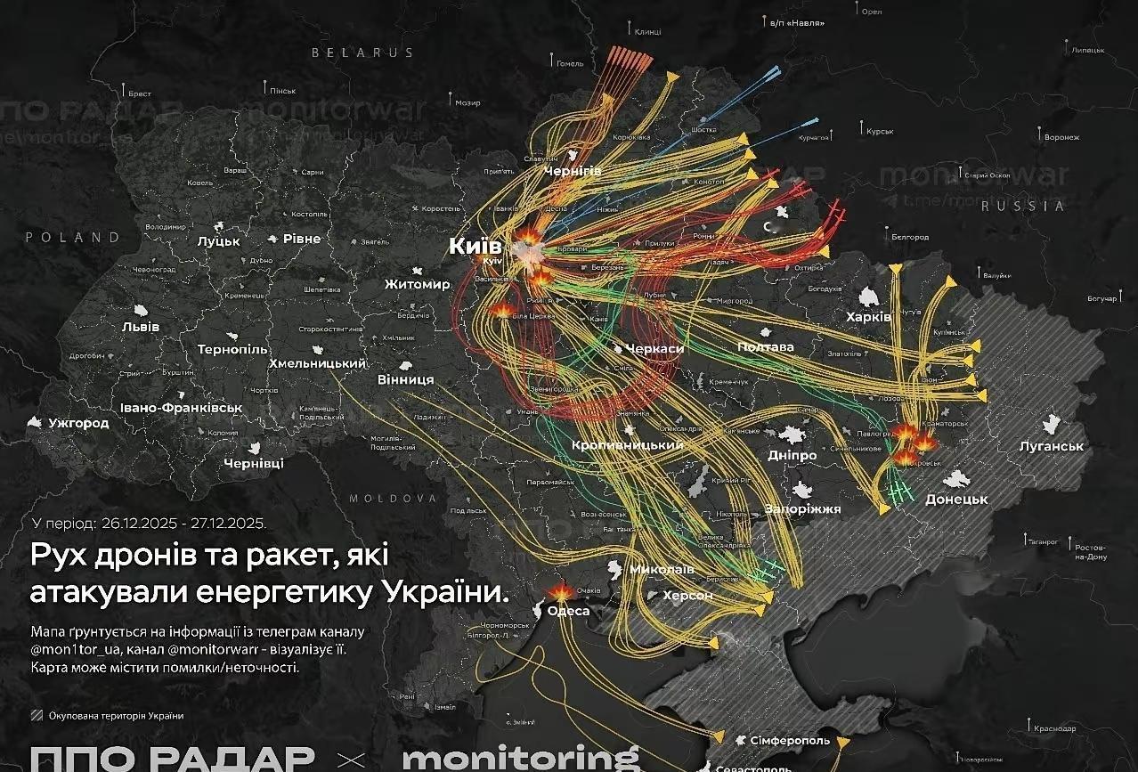 俄军继续狂轰滥炸基辅! 当地时间12月26日夜间至27日凌晨,俄罗斯空天军创记录的发射了约500架无人机、40枚导弹,其中包含“匕首”高超音速导弹,对基辅及基辅州能源设施进行疯狂轰炸。 看看俄方公布的最新打击信息图,密密麻麻的飞行路线,可以看出打的有多狠!俄方的目的很明确,边谈边打,以打促谈!