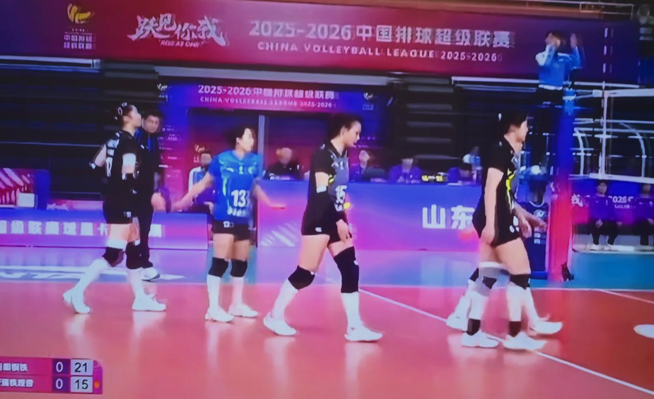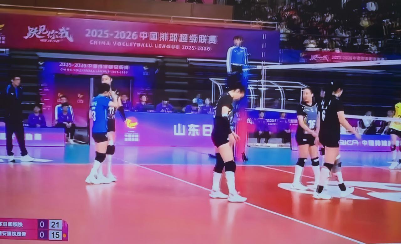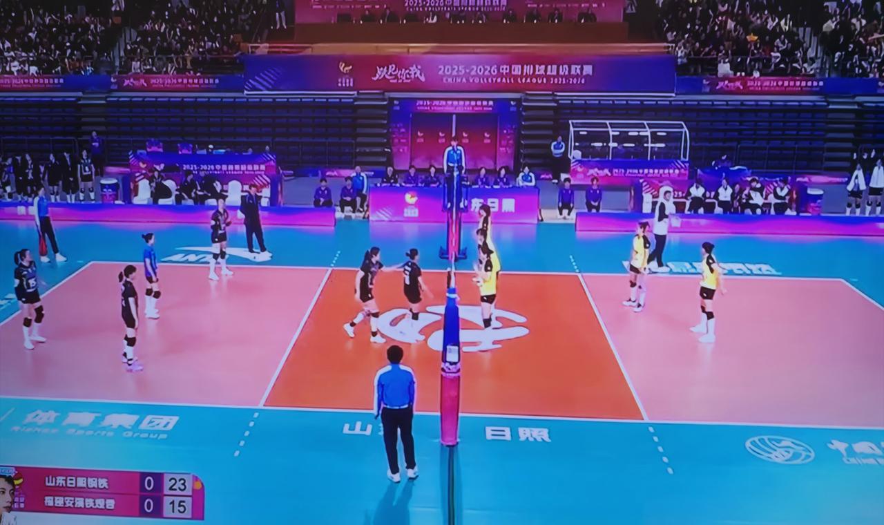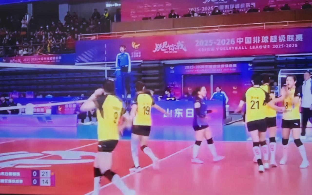 【女排超级联赛】常规赛第五轮:山东——福建 实时战况: 12月27日下午20:00时,全国女排超级联赛第五轮山东——福建的比赛在山东主场开打。第—局开始,5平,8:6,山东领先。9:6,9:7,10:7,李晨暄。11:7,孙杰。12:7,李晨暄。12:8,叶佳婧。王文涵快攻13:8。14:8,孙杰。15:8,王文涵快攻,福建暂停。15:9,16:9,17:9,郭湘玲。18:9,18:10,叶佳婧。19:10,王文涵快攻。19:12,20:12,20:13,福建发球得分,20:14。山东暂停。23:15,24:15,李晨暄。24:16,24:17,叶佳婧吊球得分。25:17,山东胜第一局,大比分1:0山东领先! 第二局比赛正在进行中……