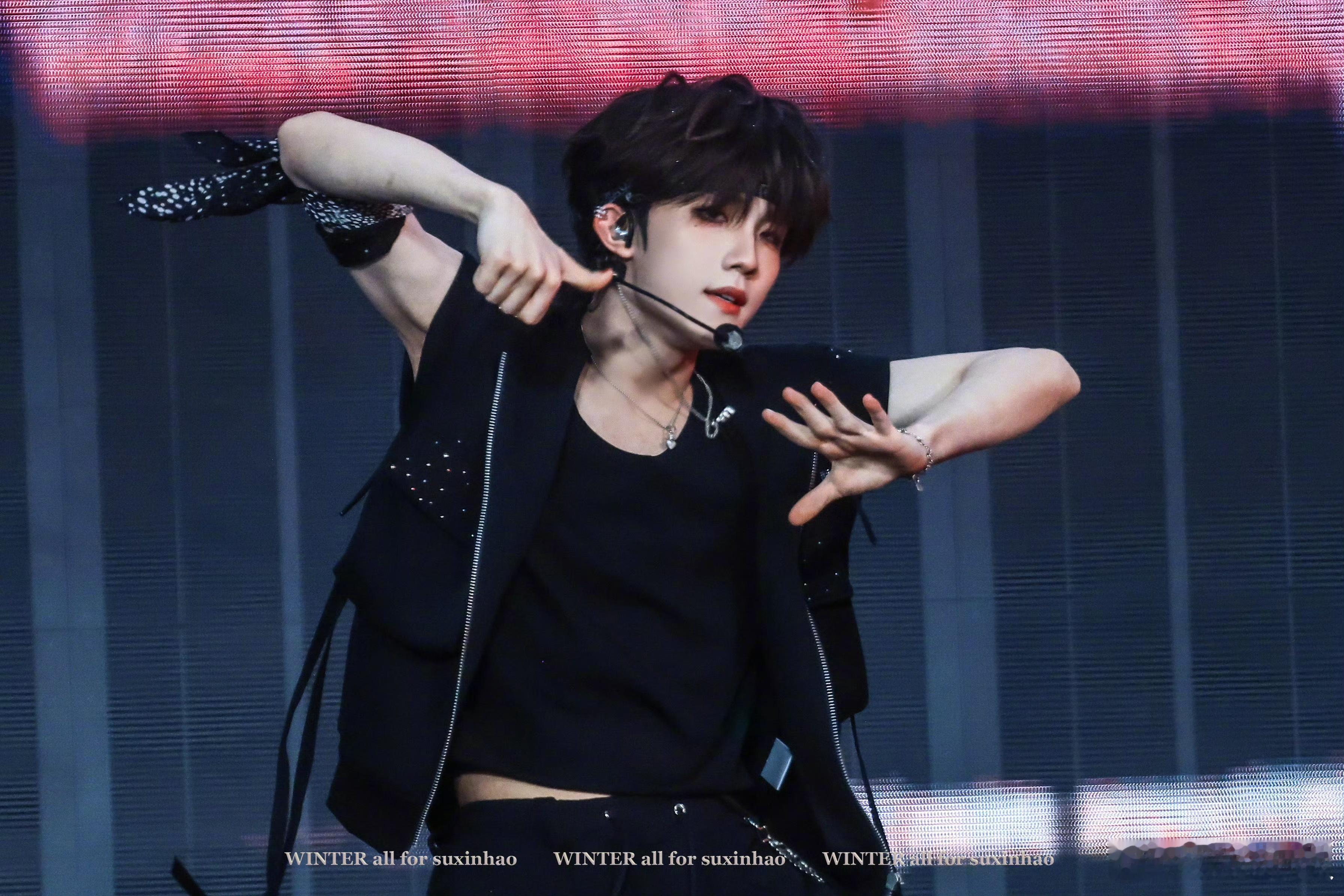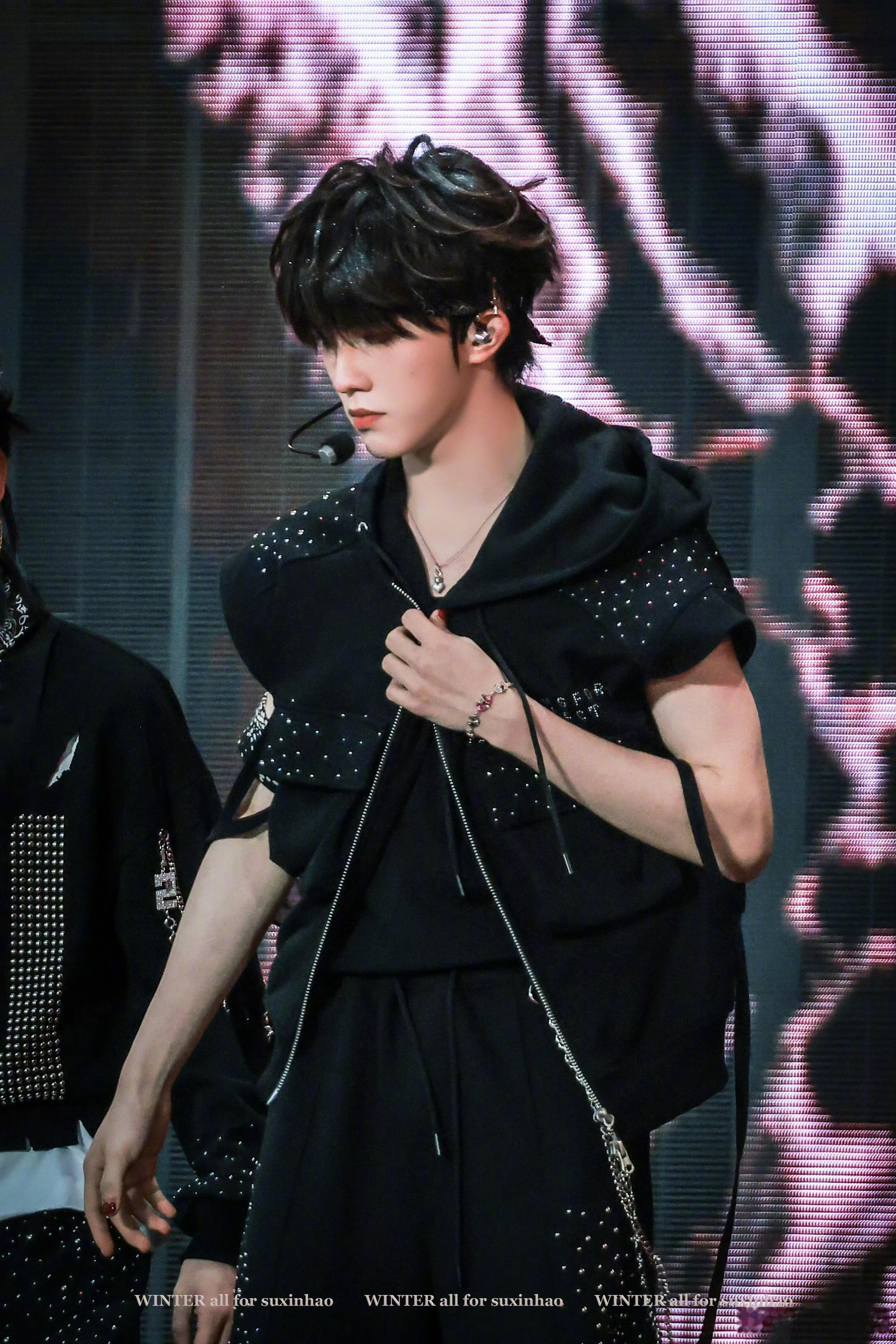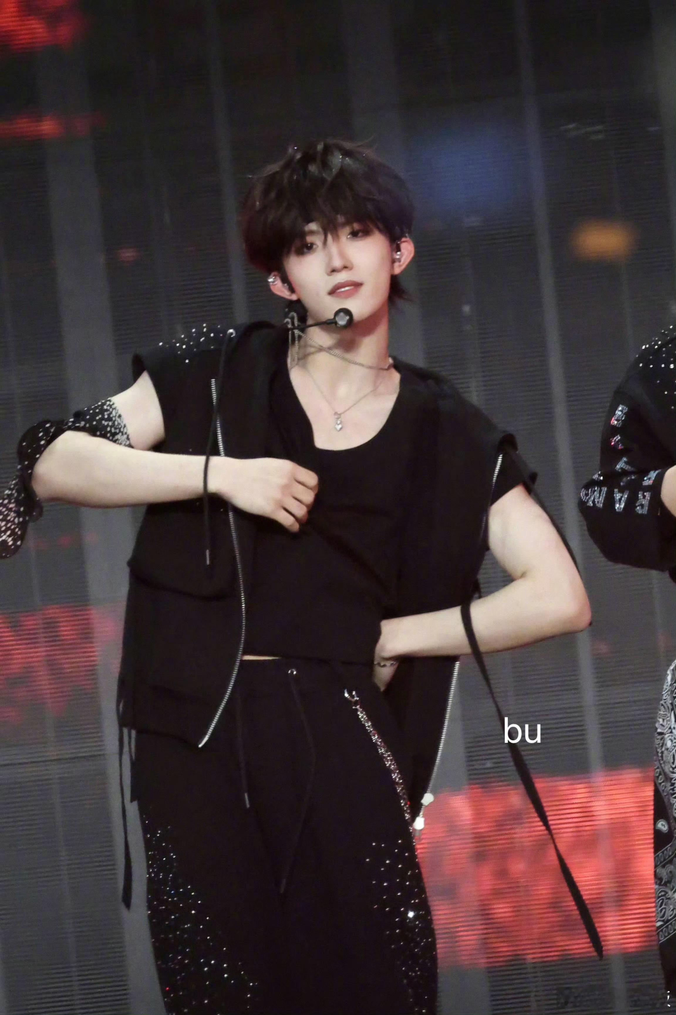 苏新皓无袖满分男 这次造型真的好狠🔥黑色无袖马甲酷到不行,肩线一出来就很能打,全包眼线小猫眼一勾,《命》舞台直接野性拉满。