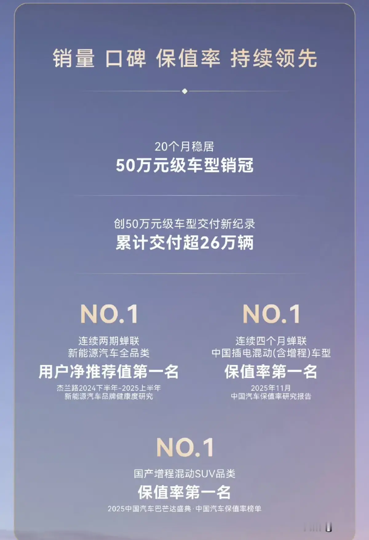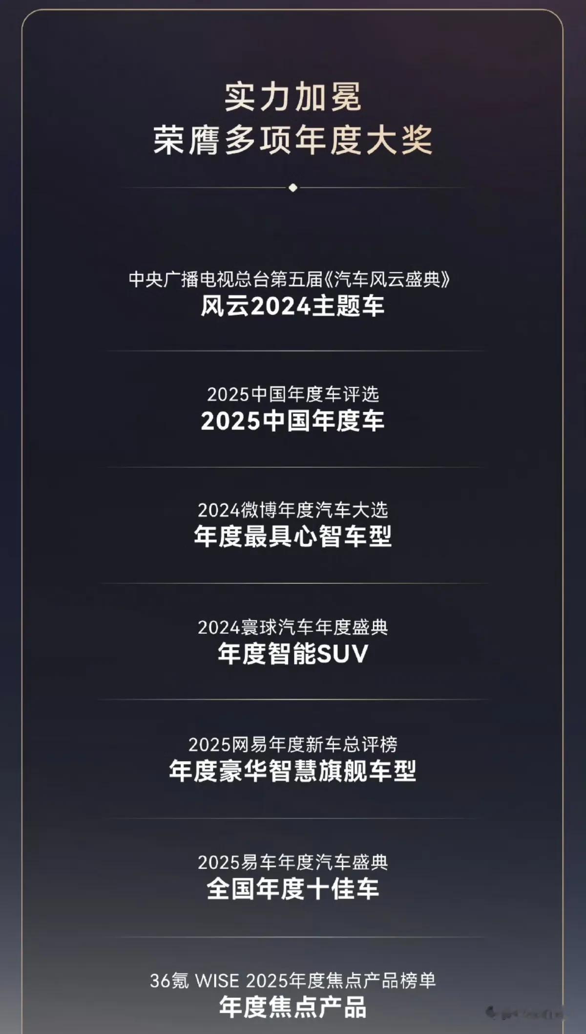 问界M9不仅在销量,在安全、智能、保值率、用户推荐率、产品魅力等多个维度全面领先!可以说是一款叫好又叫座的产品!所获荣誉数不胜数: