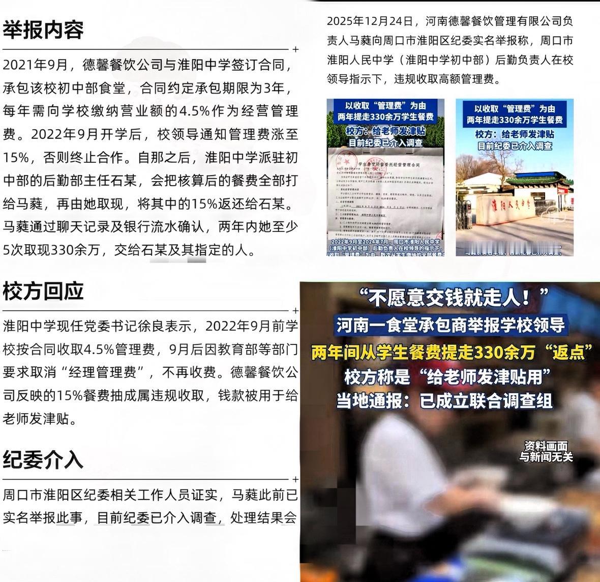 不得不说, 实名举报淮阳人民中学的马女士实在是太聪明了! 她一边配合,一边悄悄留痕,把学校以“管理费”名义违规收钱、现金交易、虚假用途等细节全部固定下来。这种冷静和耐心,比一时冲动的“鱼死网破”更有杀伤力。 真正让人寒心的是,被盯上的竟然是学生一天20块钱的餐费。 打着“教师津贴”的旗号,干着见不得光的勾当,还自以为用红笔圈账、现金往来就能瞒天过海。 马女士的行动,不仅是为自己讨公道,更是替无数被盘剥的学生和家长发声。 这件事给所有人提了个醒:沉默不一定是懦弱,有时候是在等一个合适的时机。
